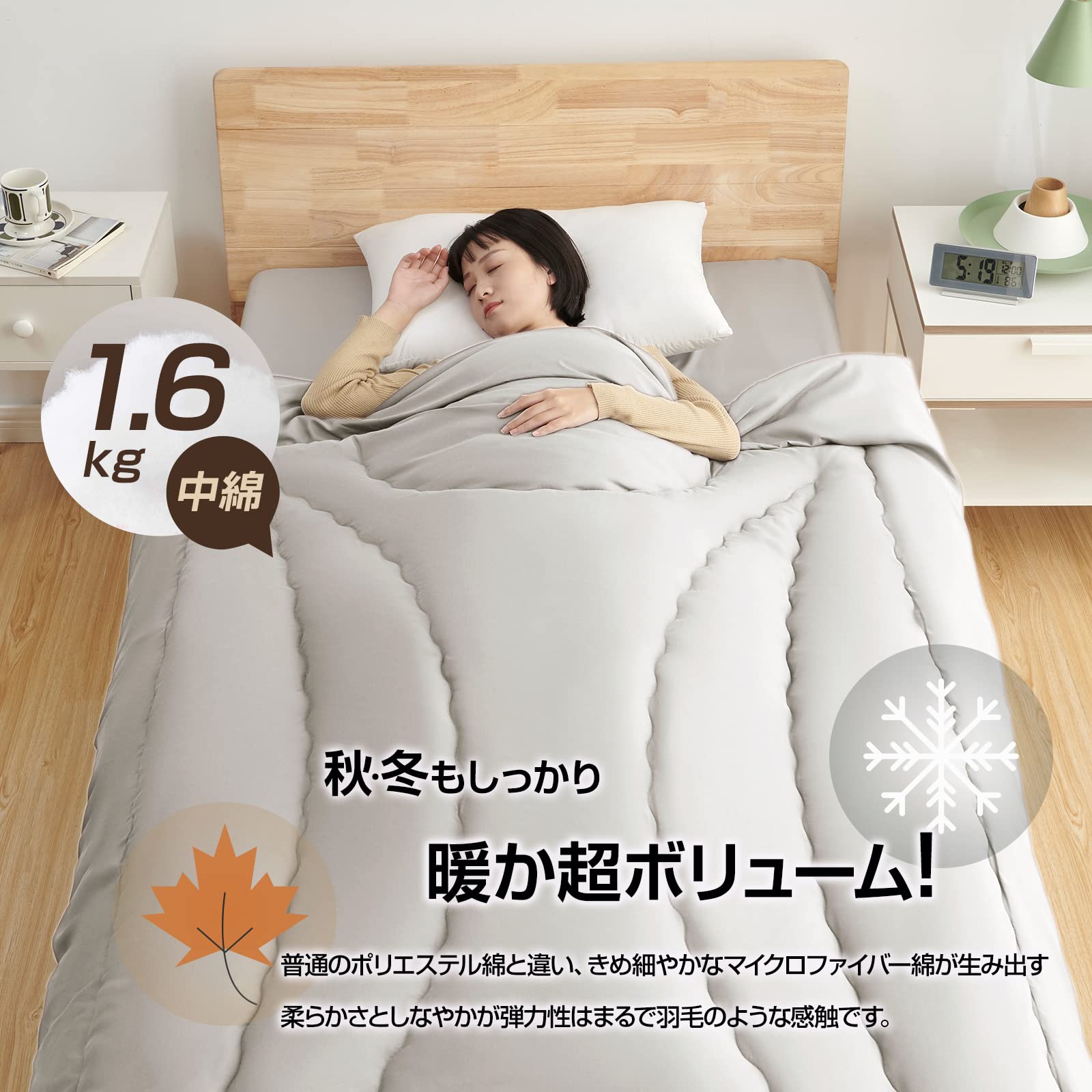 ??【暖かくて軽い、抗菌防臭】中空ポリエステルの中わたは体温で温まった空気を蓄えることができるので、保温性に優れています。重すぎず、軽すぎず、ちょうどいいボリュームでオールシーズン使えます。「防ダニ機能」を持っているので、細菌の繁殖を抑制して嫌な臭いを防ぎ、ダニを寄せ付けません。長く使えて小さいお子様にも安心です。