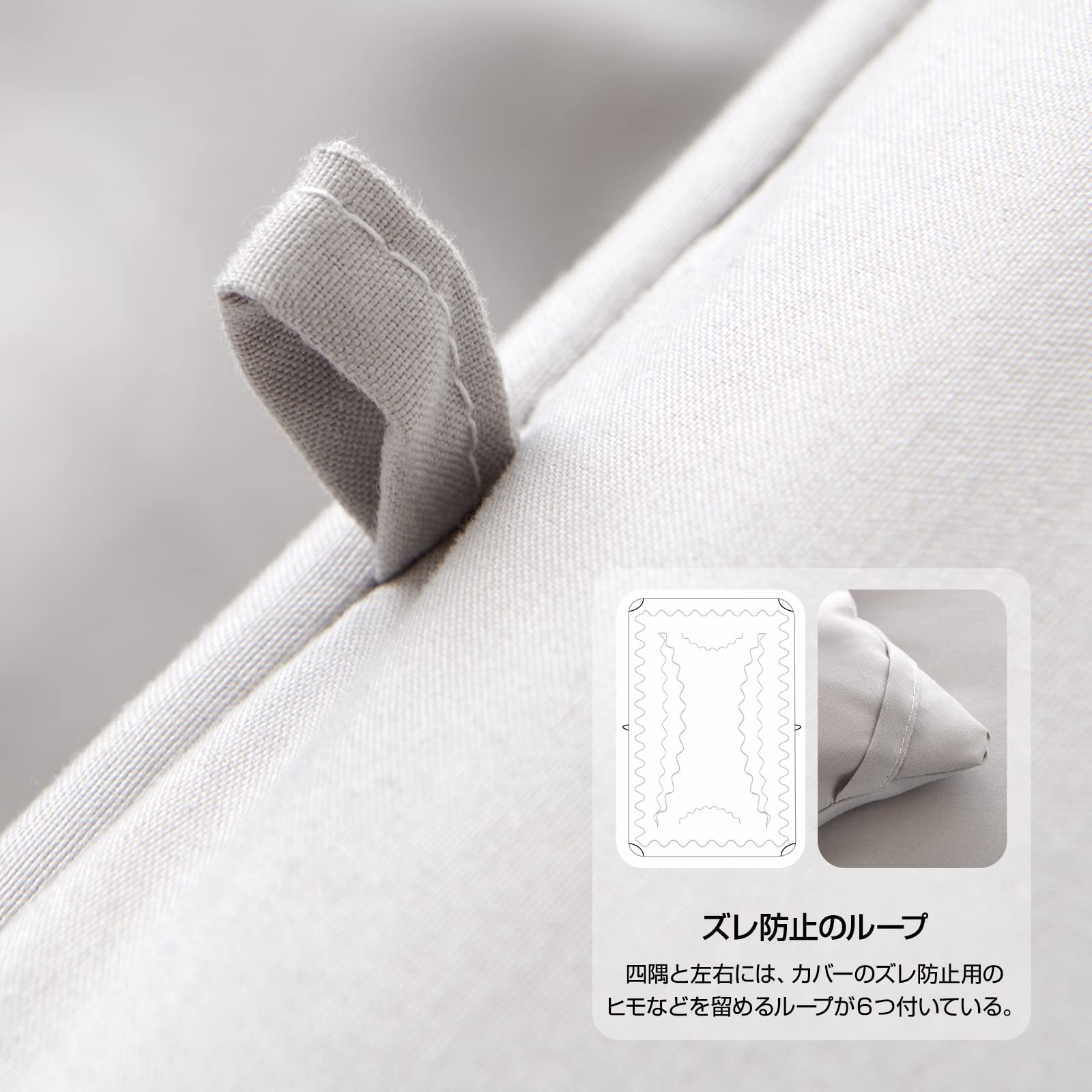??【ピーチスキン加工でとっても柔らかな触り心地】軽量わた、軽くて、保温性に優れた中綿を使用しています。さらに、やわらかな肌ざわり桃の表面のような、やわらかく、なめらかな肌触りのピーチスキン加工を施しました。洗濯してもへたりにくく、中綿が固まりません、肌の敏感な方にも安心してお使い頂けます。ズレ防止ループ付き端の8ヶ所にズレ防止用ループが付いているので、お布団がズレる心配もありません。