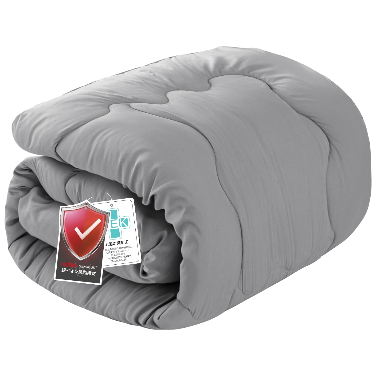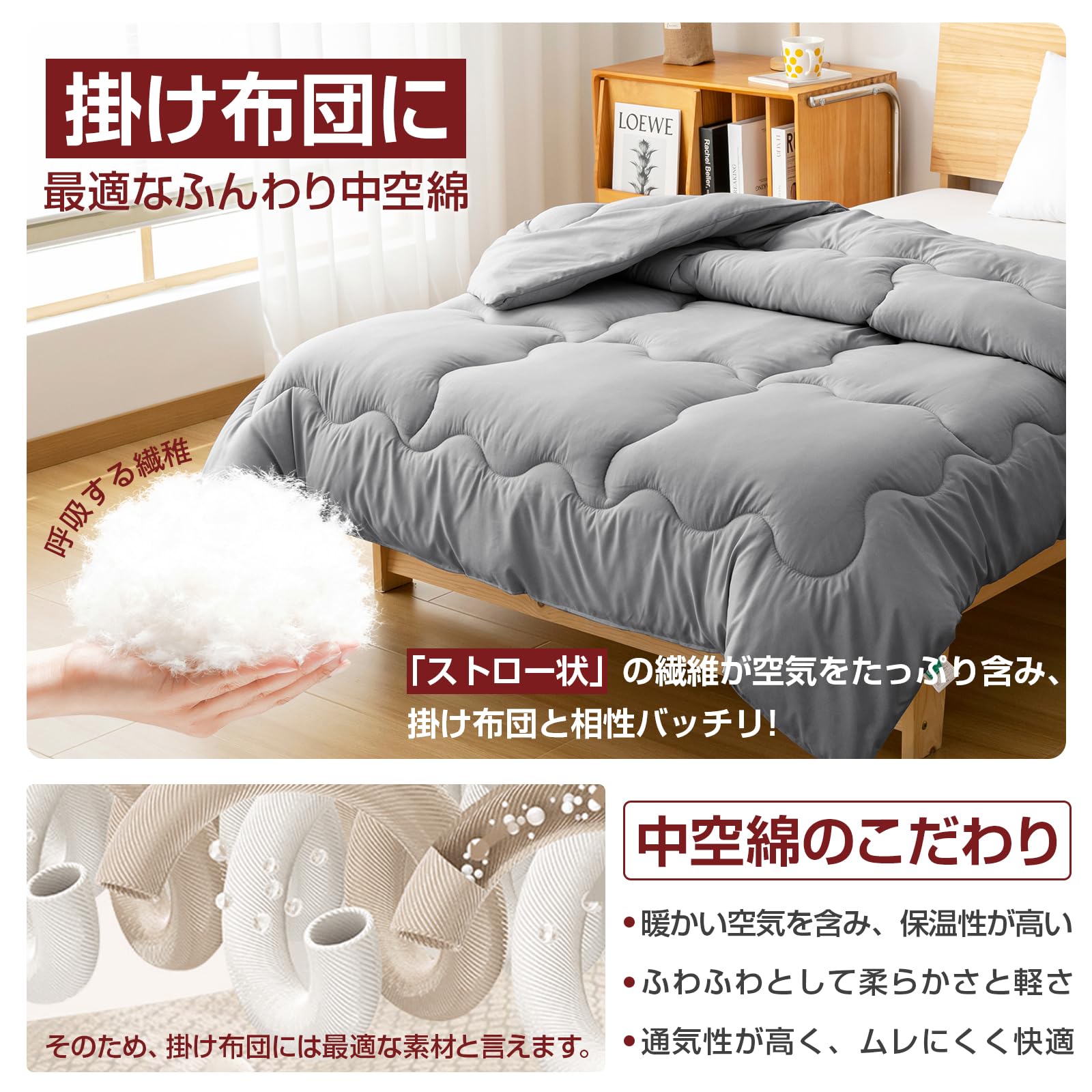 【商品仕様】掛け布団サイズ:約150x210cm(シングル掛けふとん) 側生地:ポリエステル100%(Ag+銀イオン抗菌素材) 詰め物:中空ポリエステル綿100% 軽くて持ち運びも簡単、季節を問わず長く使える掛け布団です。【8箇所ループ付き】掛けカバーと掛け布団のズレを防ぐため、8箇所にループを付けました。ずれにくく、快適にご使用できます。