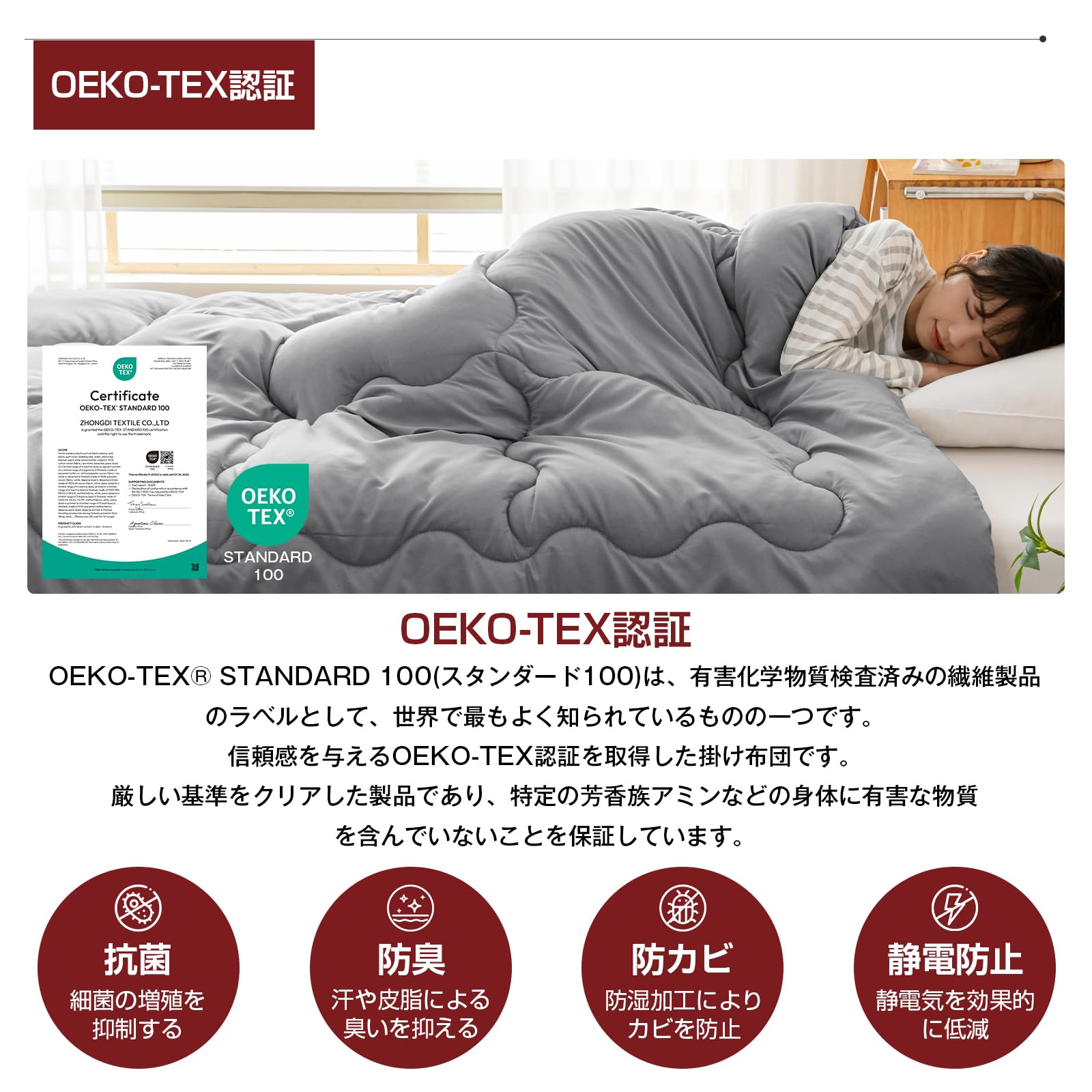 【抗菌防臭ふとん・OEKO-TEX認証・安心掛布団】アメリカの大手化学企業デュポンが開発した細菌の発生を抑える抗菌剤SILVADURを使用。掛け布団の生地だけでなく中綿まで防ダニ・抗菌防臭加工を施し、いつでも清潔でいられます。確実な抗菌防臭・防ダニ効果はSEK認証も獲得し、清潔さは安心できます。通気性もアップし快適な寝心地を感じられます。信頼感を与えるOEKO-TEX認証を取得した掛ふとんです。厳しい基準をクリアした製品であり、特定の芳香族アミンなどの身体に有害な物質を含んでいないことをしています。