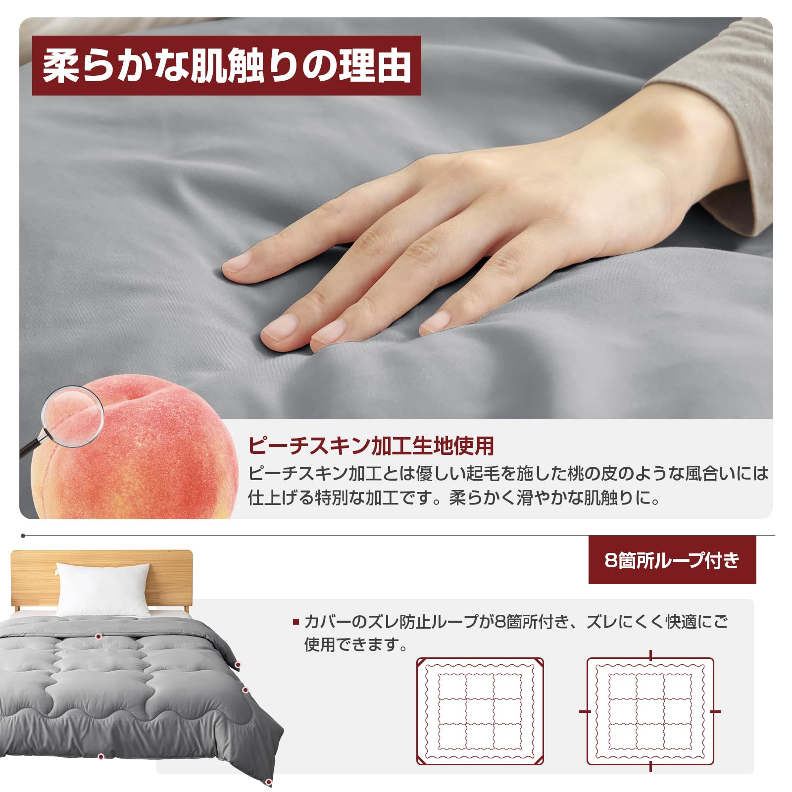 【ピーチスキン加工・冬掛け布団】桃のようなソフトタッチで、素肌に触れてもやわらかく心地いいです。静電気抑制(防止)加工で乾燥な季節でもご心配なく使用できます。なお、デリケートなお肌の方、お子様にも安心してお使いいただけます。