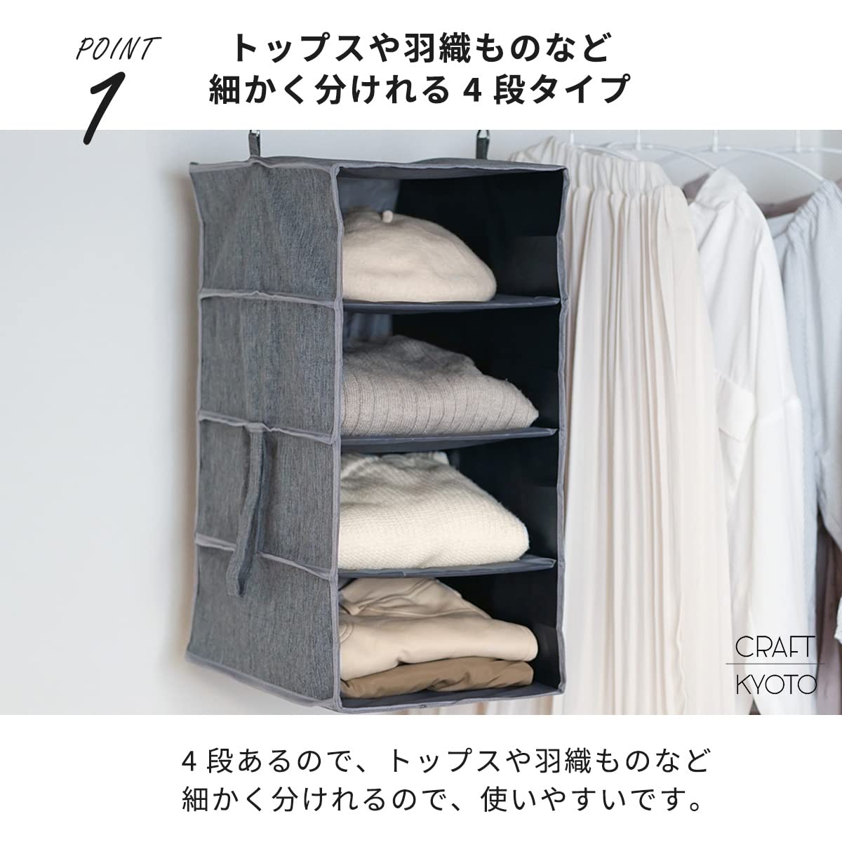 セーターや帽子などを分類して収納できる4段タイプのハンギンラック。