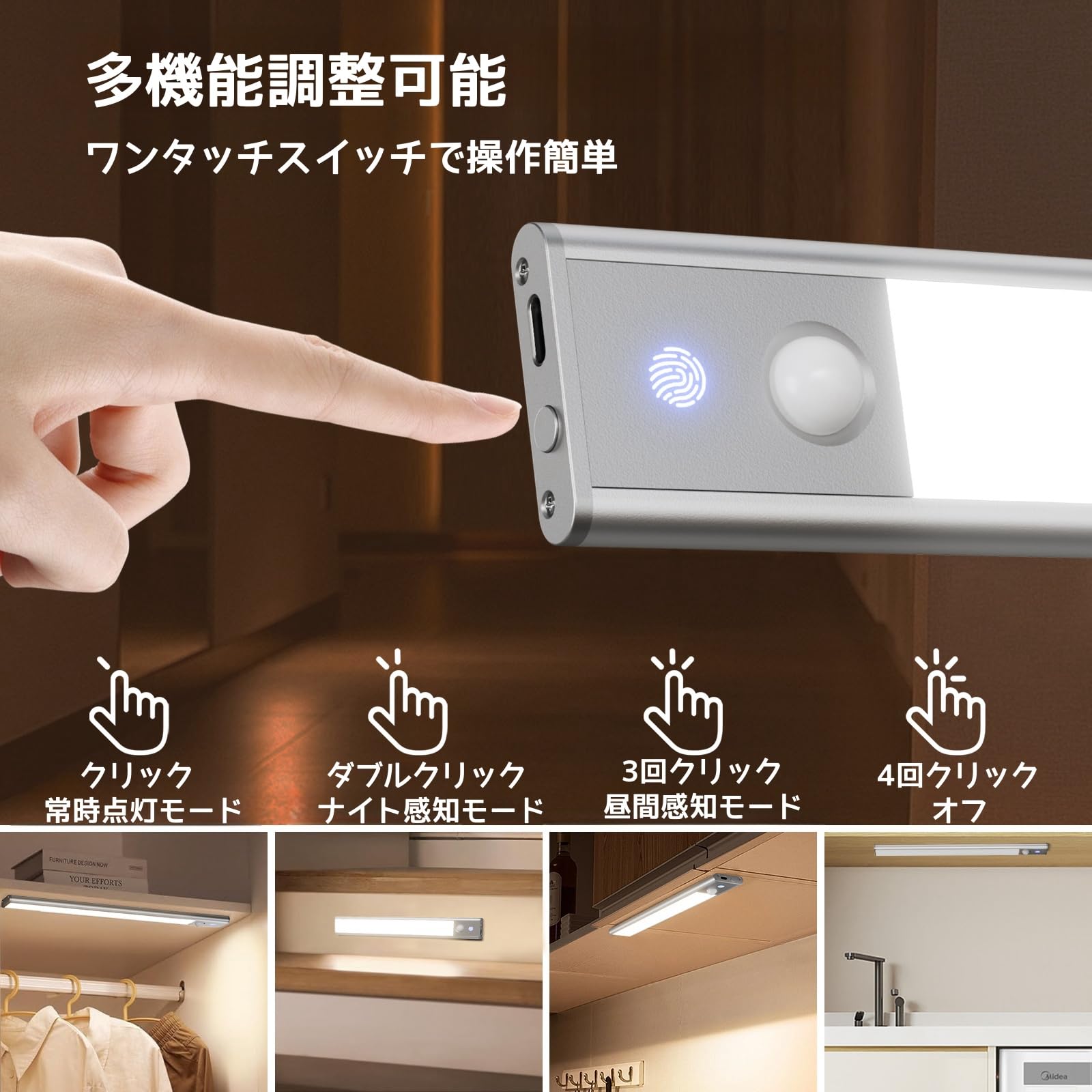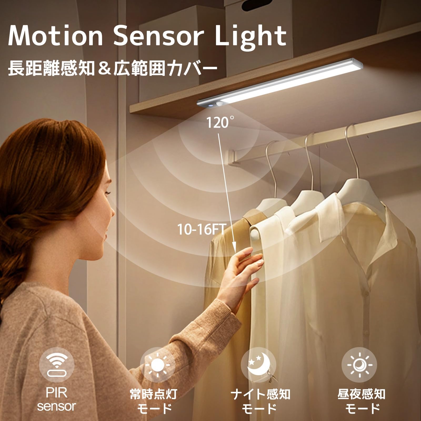 高感度人感センサーライト&3つの点灯モード:Quntisキャビネットライトは高感度PIR人感センサーを搭載し、120°の範囲と5メートルの距離で動きを感知して自動点灯。約20秒後に動きがなければ自動で消灯します。常時点灯モード、夜間モード(暗い環境でのみ点灯)、終日モード(動きがあればいつでも点灯)の3つのモードが選べ、クローゼット、ショーケースライトやキッチンなど様々な場所で活用できます。