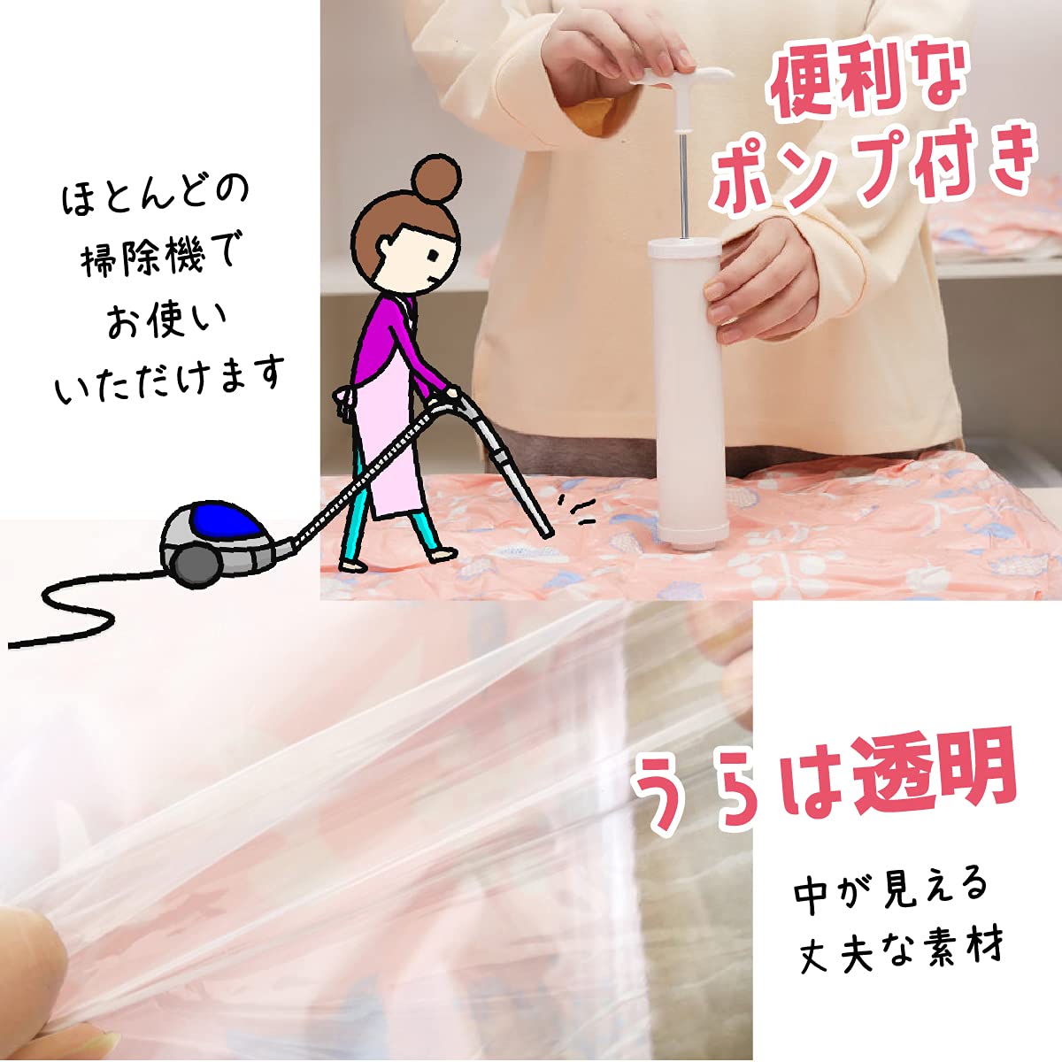 【便利な手動ポンプ付き】手軽に圧縮できる手動ポンプ付き。ポンプを使わず掃除機でも圧縮できます。本セットのポンプのカラーはピンクまたは白です。