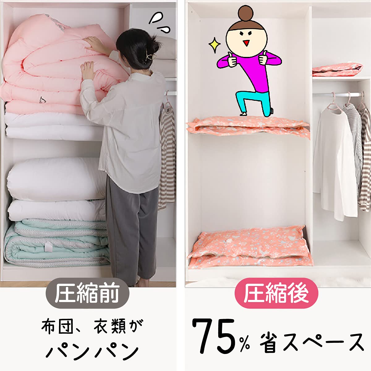【省スペース】狭い収納スペースを有効活用できる圧縮袋です。布団、かさばるダウンジャケットなど約75%圧縮できて効率よく収納できます。