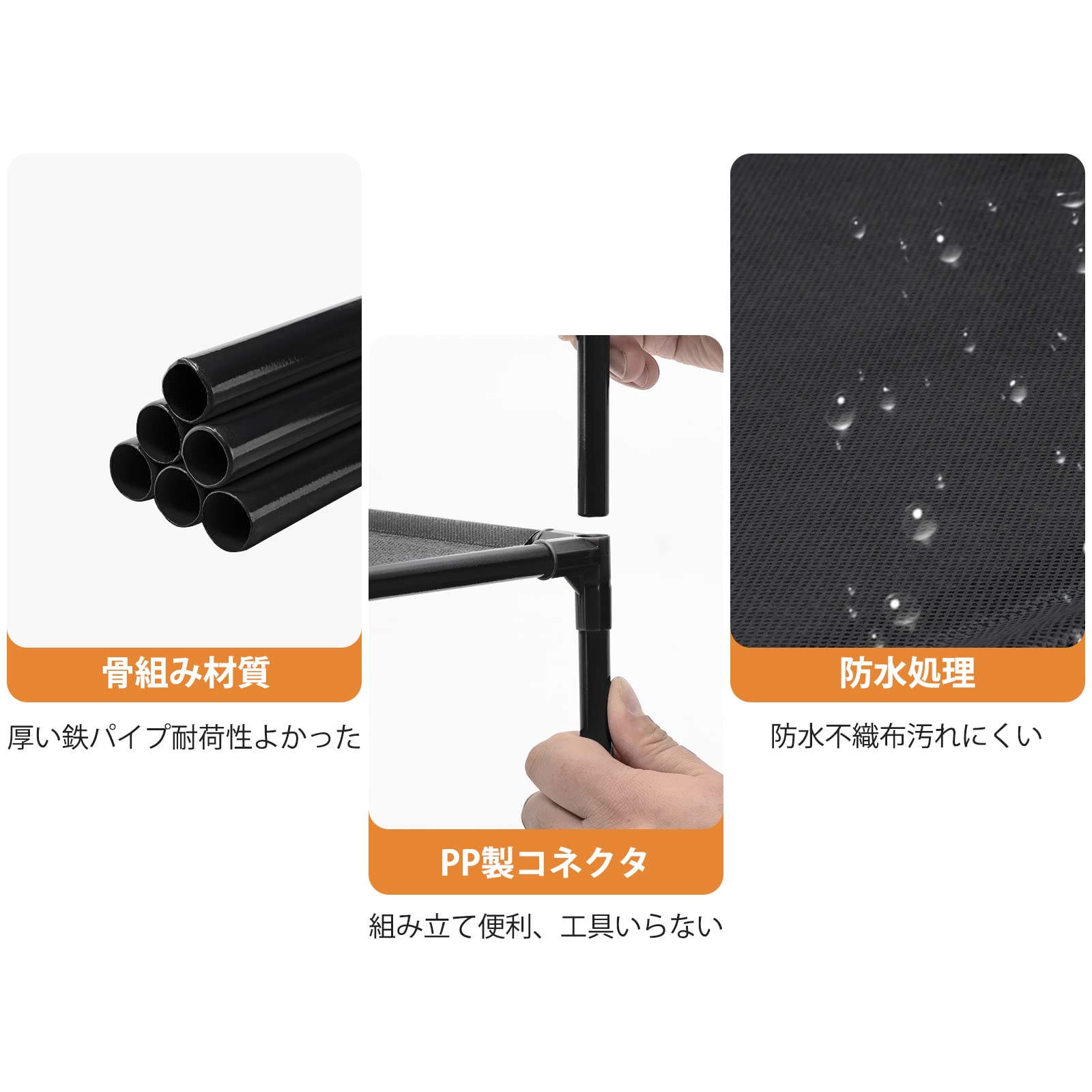 【軽量・丈夫】1.直径13mmの太い鉄パイプ-靴棚全体の耐荷重を向上させて耐久性にも優れています。2.防水層付き不織布-優れた耐水性と防汚性、水滴と埃を布巾で拭き取れやすいです。3.耐摩耗ジョイント-パイプをしっかり支え、靴ラックの安定性を高めます。
