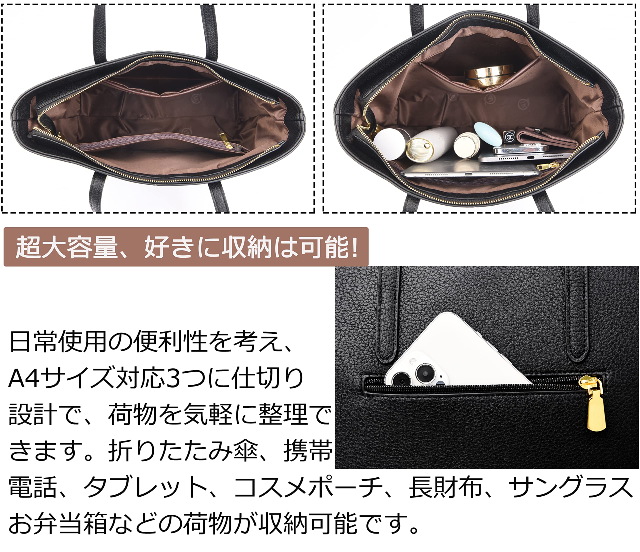 ★★★★★【大容量】A4サイズがすっぽり入る大容量。中央に2つのコンパートメントがあり、収納や出し入れが簡単です。財布、手帳、スマートフォン、書類、折り畳み傘、雑誌、化粧品など、必要なものをたくさん収納できます。