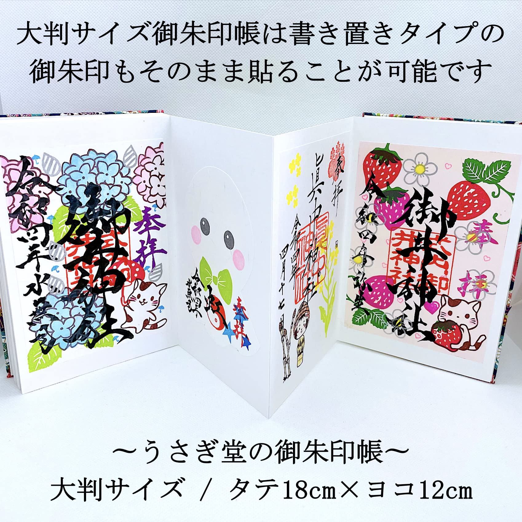 【サイズ】 タテ約18cm ×ヨコ約12cm×厚み 約1.5cm 市場では「大判」などと表記して販売されている使いやすい売れ筋のサイズです! 蛇腹タイプの24ページ(両面使いで48ページ) 【内容】 ◆御朱印帳 本体1冊 ◆手軽に貼れる表題シール2枚(御朱印帳の文字入り1枚・無地1枚)用途に合わせてお好きな物をどうぞ! 【和紙】 綺麗な仕上がりの御朱印帳蛇腹和紙を使用しております。 『墨が裏面に染み出ない御朱印帳』となっておりその品質や見た目のクオリティ・使い心地は抜群です。大変稀にですが蛇腹本紙に小さな黒い点がある事がございます。原紙の品質基準を満たした和紙ですが製造過程で発生するパルプ繊維や木くず・樹皮・黒点(夾雑物)は和紙製品の一部です。和紙の特徴でもありますので予めご了承下さい。 【その他】 ◆御朱印帳専門店うさぎ堂の商品は全て一冊ずつ手作りで作成されております ◆裁断により表紙柄の出方が一つずつ異なる場合があります ◆出来る限り本当の色合い・生地感を見て頂けるように撮影をしておりますが多少の色の誤差が出る可能性がありますので予めご了承下さい