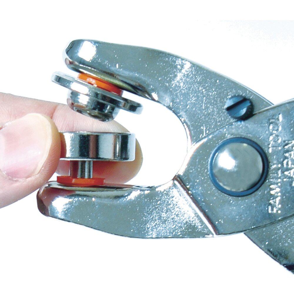 ●カシメ作業の前にベルトポンチなどで下穴をあけてご使用ください●袋もの、カーテン・服飾など穴の補強・アクセントに。●別売の交換コマを取り付けますと、4mm・5mm・7mm・8mm・10mm・12mm・15mmすべてのサイズに使用できます。●プライヤー型なので、連続作業などに優れています。