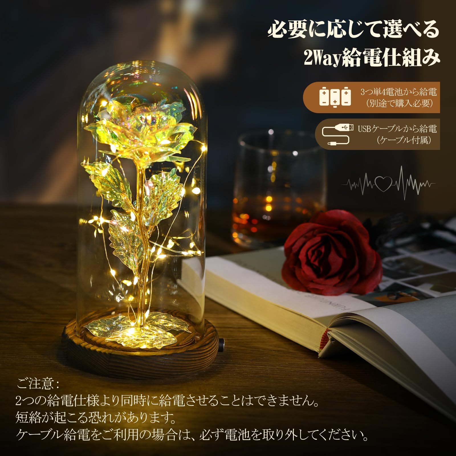「キラキラLEDライト付き」USB給電と3個単4電池から2つの給電稼働させる仕様より必要に応じてライトアップさせる可能です。ローズをより美しく見せるストリングLEDライトが枝に巻き付いてあり、明るくキラキラ発光してくれて、発熱もほとんどありません。暖かい光が優しく温かく、ロマンチックな雰囲気を作り出してくれます。(ご注意:ケーブルと電池を同時に使用することは禁止です。同時に使用しないように心がけましょう。)