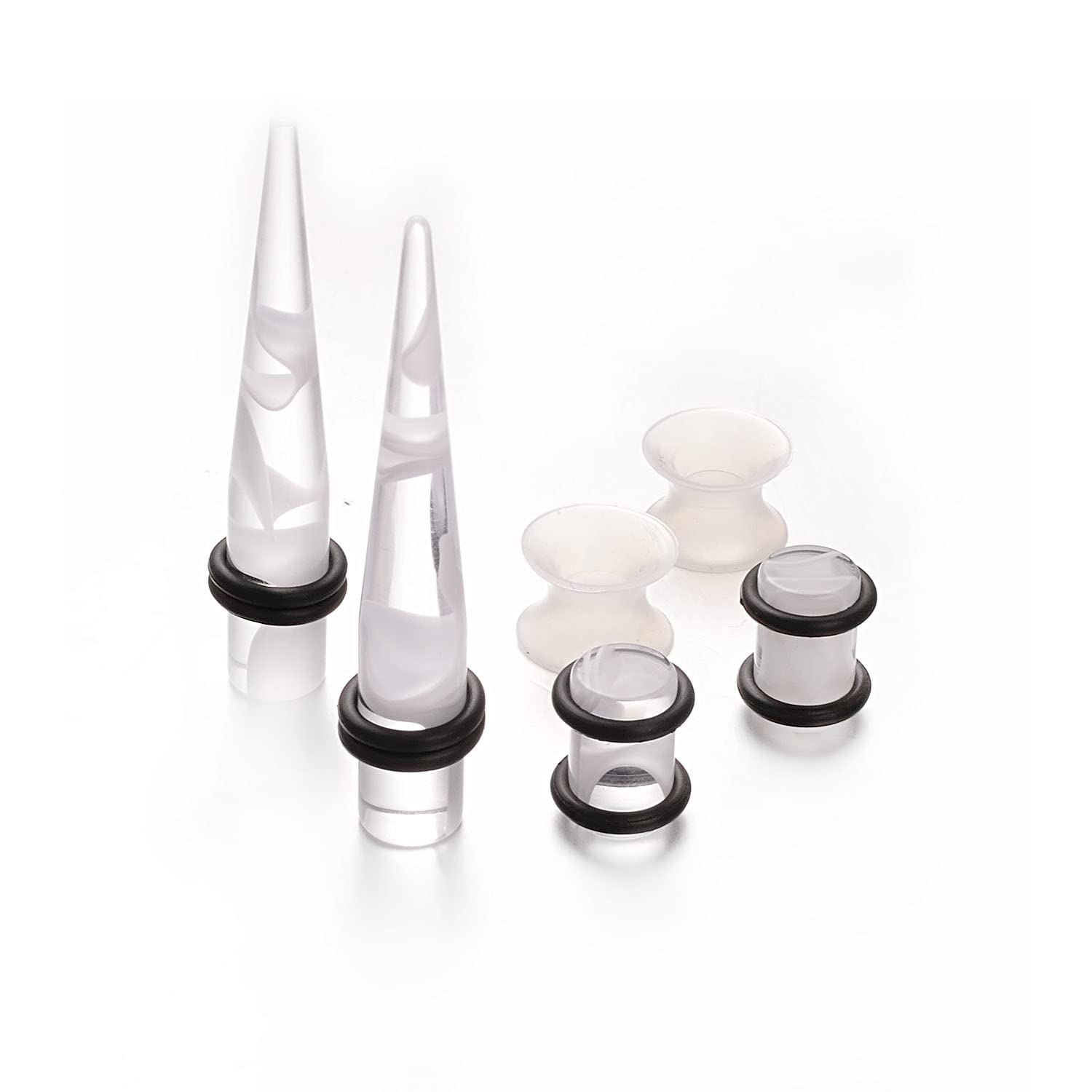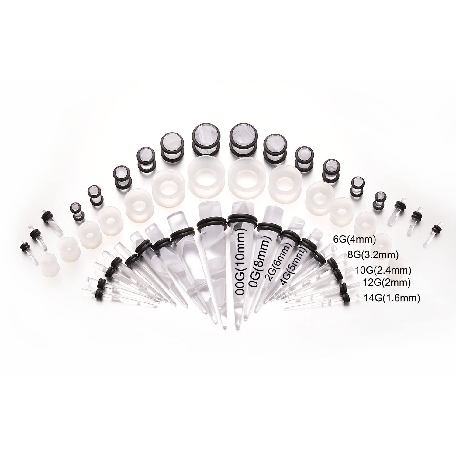 【商品の内容】ダブルフレア トンネル(シリコン製):7ペア/14点。サイズ:00G-10mm、0G-8mm、2G-6mm、4G-5mm、6G-4mm、8G-3.2mm、拡張器セット(アクリル製):18ペア/36点。サイズ:00G-10mm、0G-8mm、2G-6mm、4G-5mm、6G-4mm、8G-3.2mm、10G-2.4mm、12G-2mm、14G-1.6mm。非常に費用対効果の高い拡張ピアスセットです!初心者にもプロにもおすすめの一品。