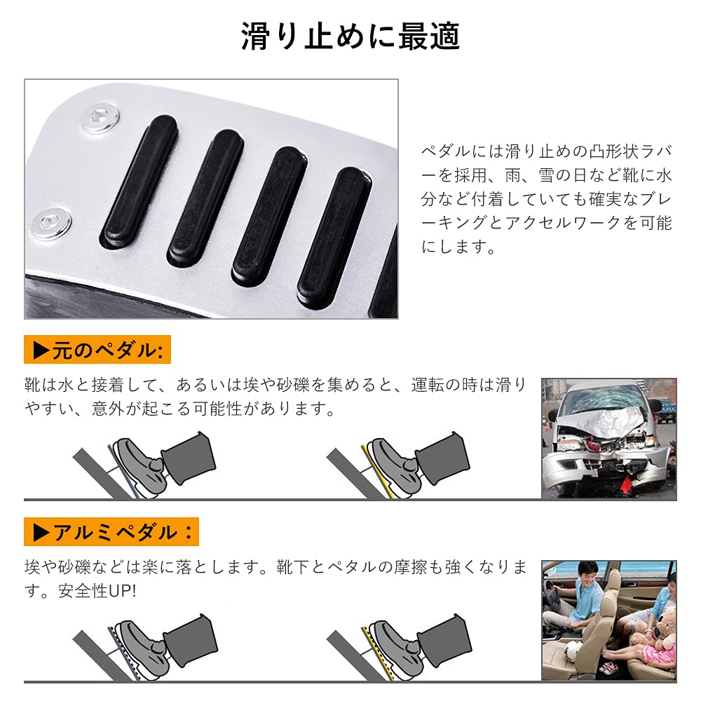 【滑り止めに最適】アルミペダルには滑り止めの凸形状ラバーを採用しており、雨、雪の日など靴に水分など付着していても確実なブレーキングとアクセルワークを可能にします。滑る心配をすることはありません。どんなん時でもしっかりとグリップ感を保持し、足元の操作性を向上させます。安全性UP、運転性UP。