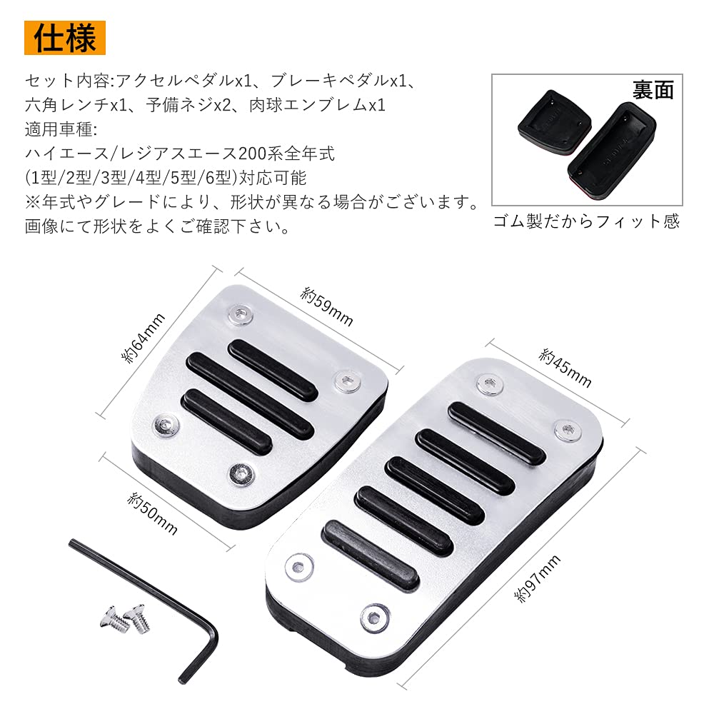ハイエース 200系 アルミペダル ペダルカバー ハイエース/レジアスエース 200系 1型 2型 3型 4型 5型 6型 ペダル アクセサリー カスタマ パーツ 滑り止め 内装 アクセルペダル ブレーキペダル ブレーキ アクセル シルバー 2ピース