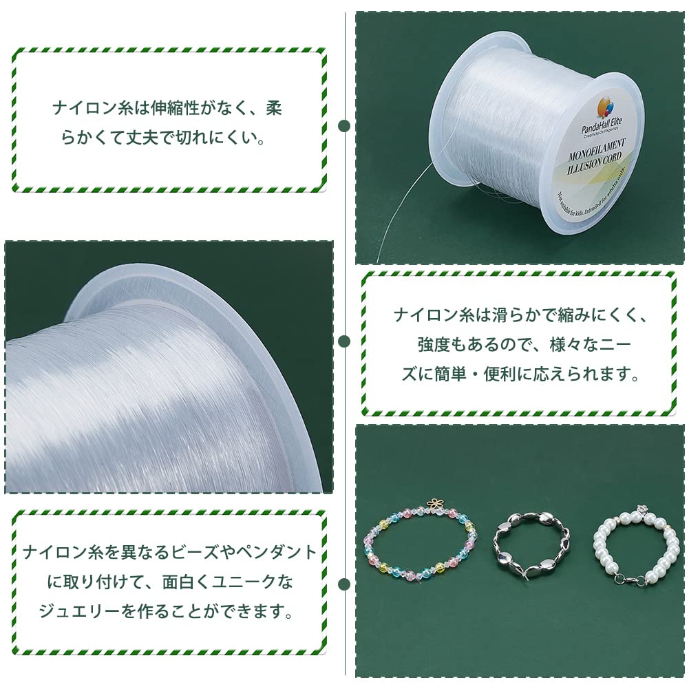 素材:クリアナイロンコードは、ナイロン製で強度が高いのが特徴です。ビーズコードは非常に丈夫で、ジュエリークラフトに最適です。