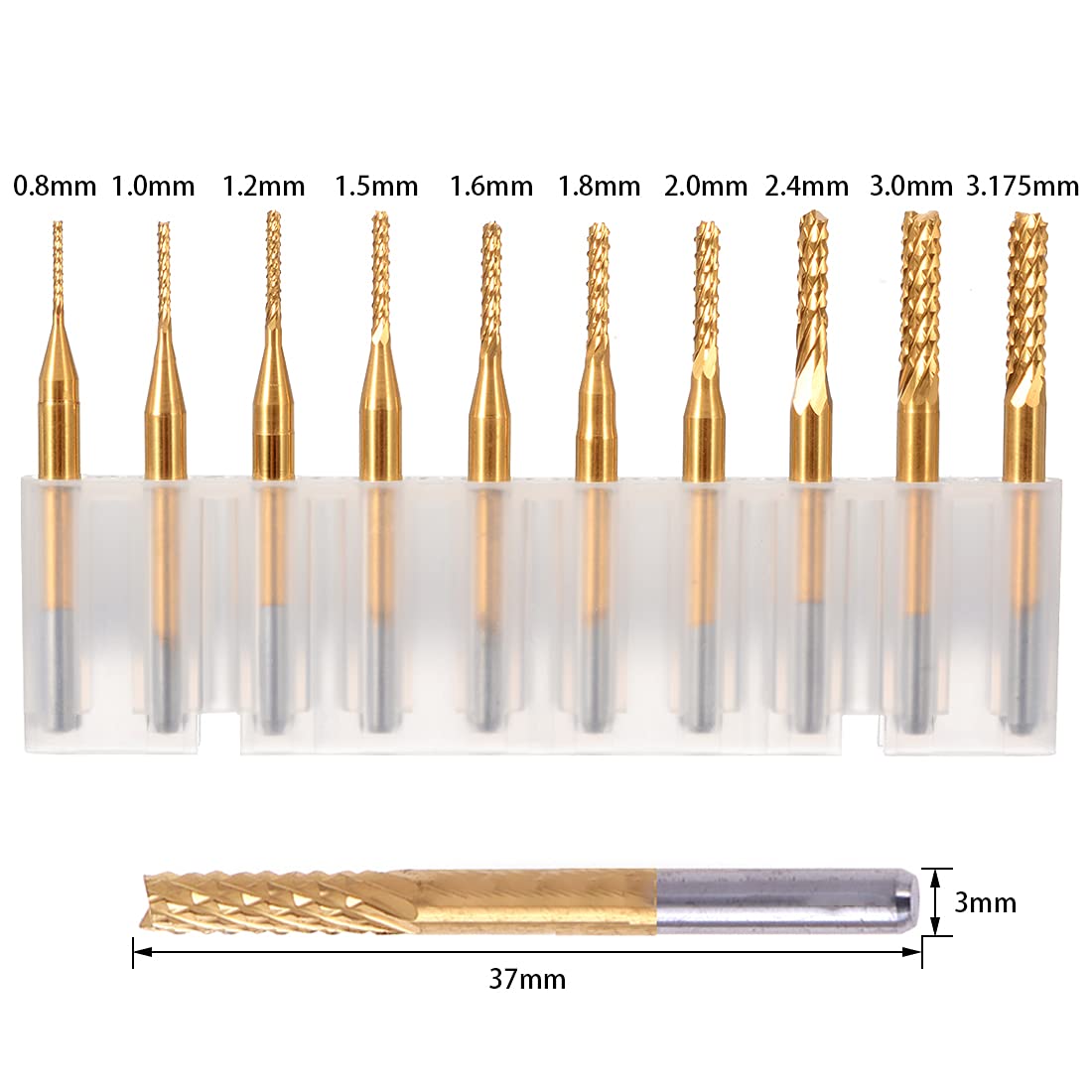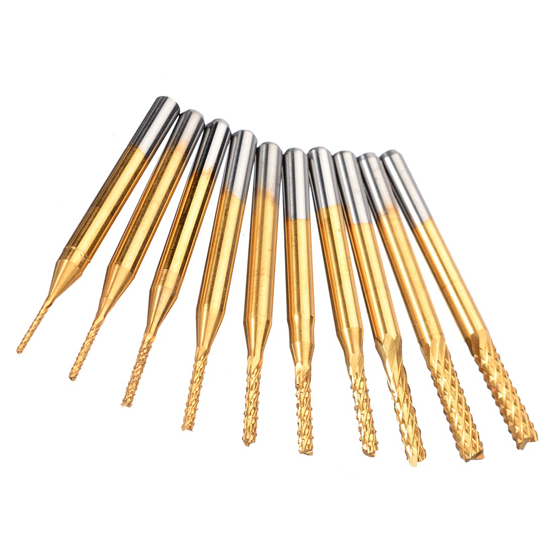 【在庫のみ】10ピース エンドミル CNC フライスカッター 0.8-3.175 mm チタン・コート・カーバイド 精密ビット ロータリーバーセット 彫刻ビット タングステンバー高速度 工具 切削 研磨用