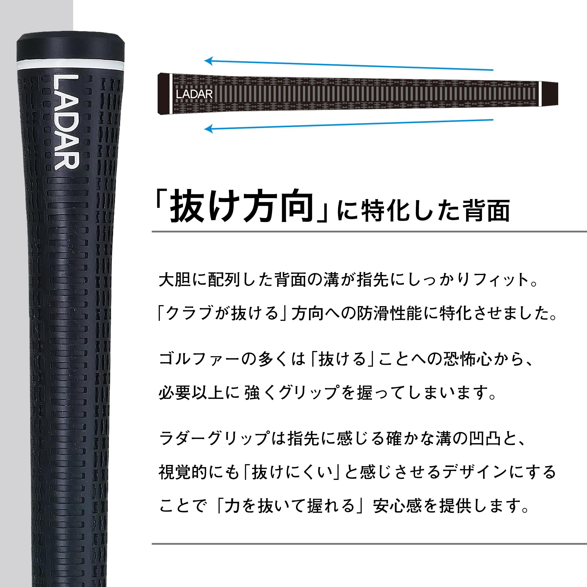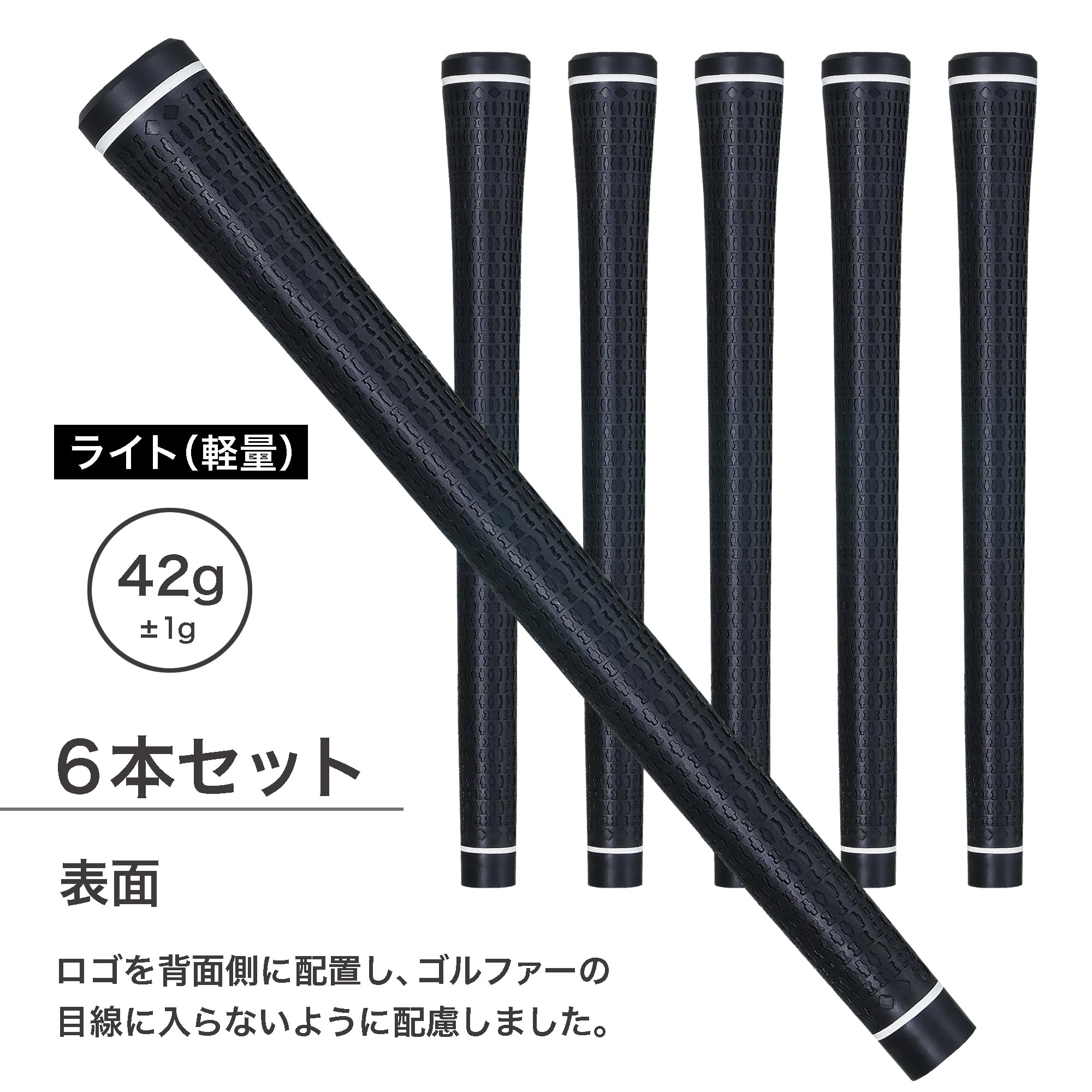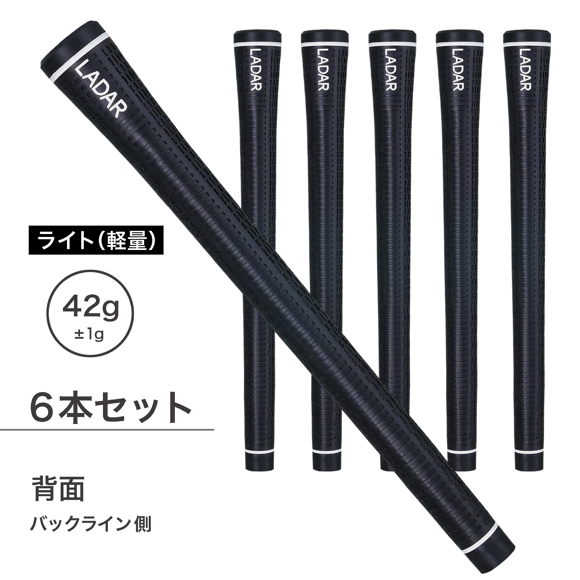 LADAR GRIP ラダーグリップ ライト(軽量) 6本セット Made in Japan 1本あたり 重量:42g ±1g 口径:M58 バックラインあり 素材:エラストマー(熱可塑性樹脂) 硬度:55 ルール適合 ブランド LADAR(ラダー) 色 ブラック グリップタイプ バックラインあり グリップサイズ M58 LADAR(ラダー)