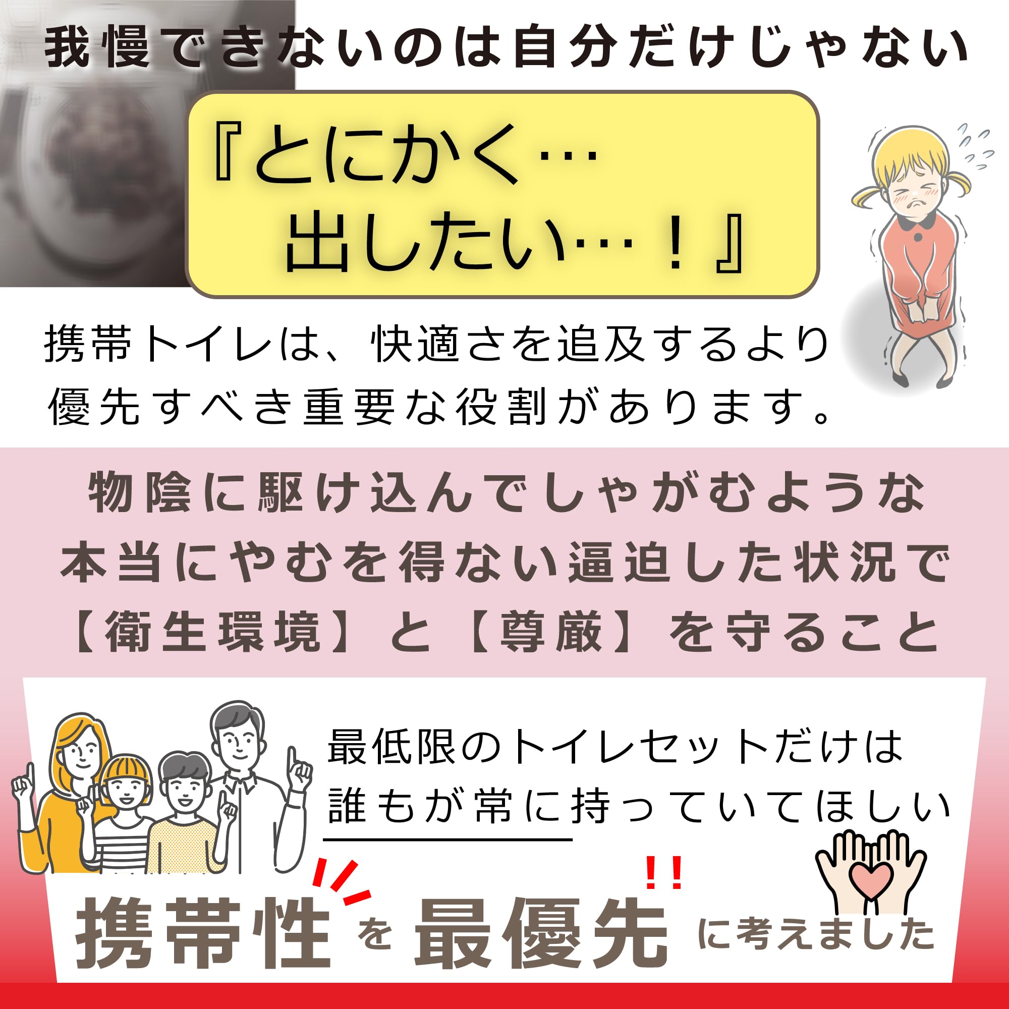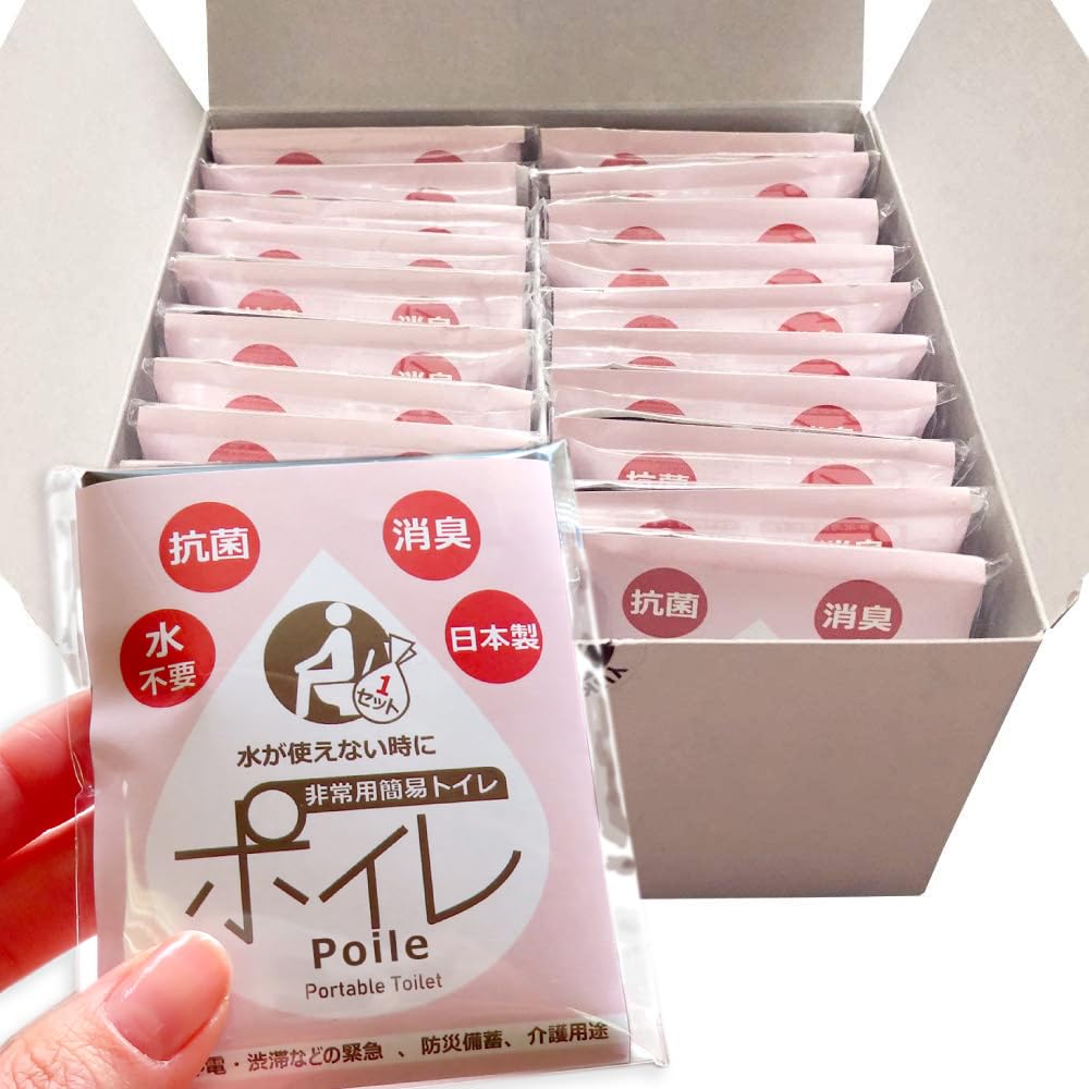 <2025年10月:外装の箱が無地箱から印刷箱になりました>【 特徴 】1回分ずつ個包装された携帯用の簡易トイレセット(非常用トイレ)です。小便・大便どちらにも使用でき、水不要で処理可能な抗菌性凝固剤入り。 アウトドア・登山・キャンプなどの携帯トイレはもちろん、防災リュック・非常用持ち出し袋・避難用品にもおすすめ。 企業・自治体・学校などの配布用防災グッズ、避難所備蓄としても適しています。 災害時に困ることの上位「トイレ問題」対策として、非常食や水と同じくトイレ備蓄をご検討ください。