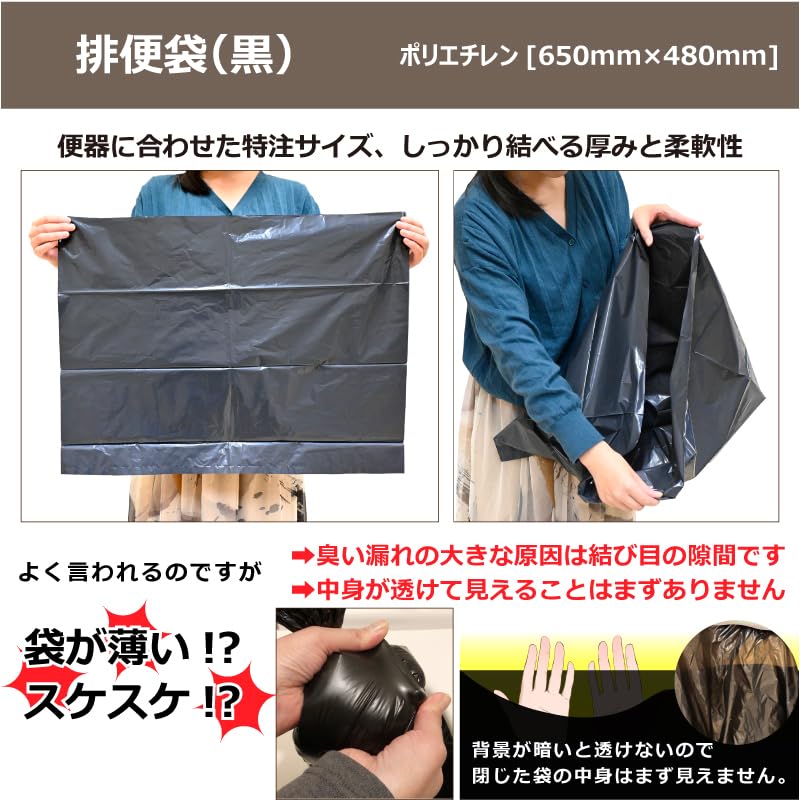 【 排便袋について 】排便袋は日本の家庭用トイレに合わせたサイズ(約650×480mm)で、便器にかぶせて使用可能。黒色ポリエチレン製で中身が透けにくく、しっかり結べる厚み。 簡易トイレとして非常時でも使いやすいよう設計されています。「袋が薄い」と感じられることがありますが、臭い漏れの主因は厚さではなく結び目の隙間や袋の材質・構造です。 数ミクロンの厚さの差で選ぶより、防臭性能が必要な場面では専用の防臭袋との併用をおすすめします。 お子様や高齢の方でも扱いやすく、処理しやすいバランスを意識した仕様です。 ※静電気や湿気により袋が開きにくい場合があります。 指を湿らせる、または開け口を揉み合わせると開きやすくなります。