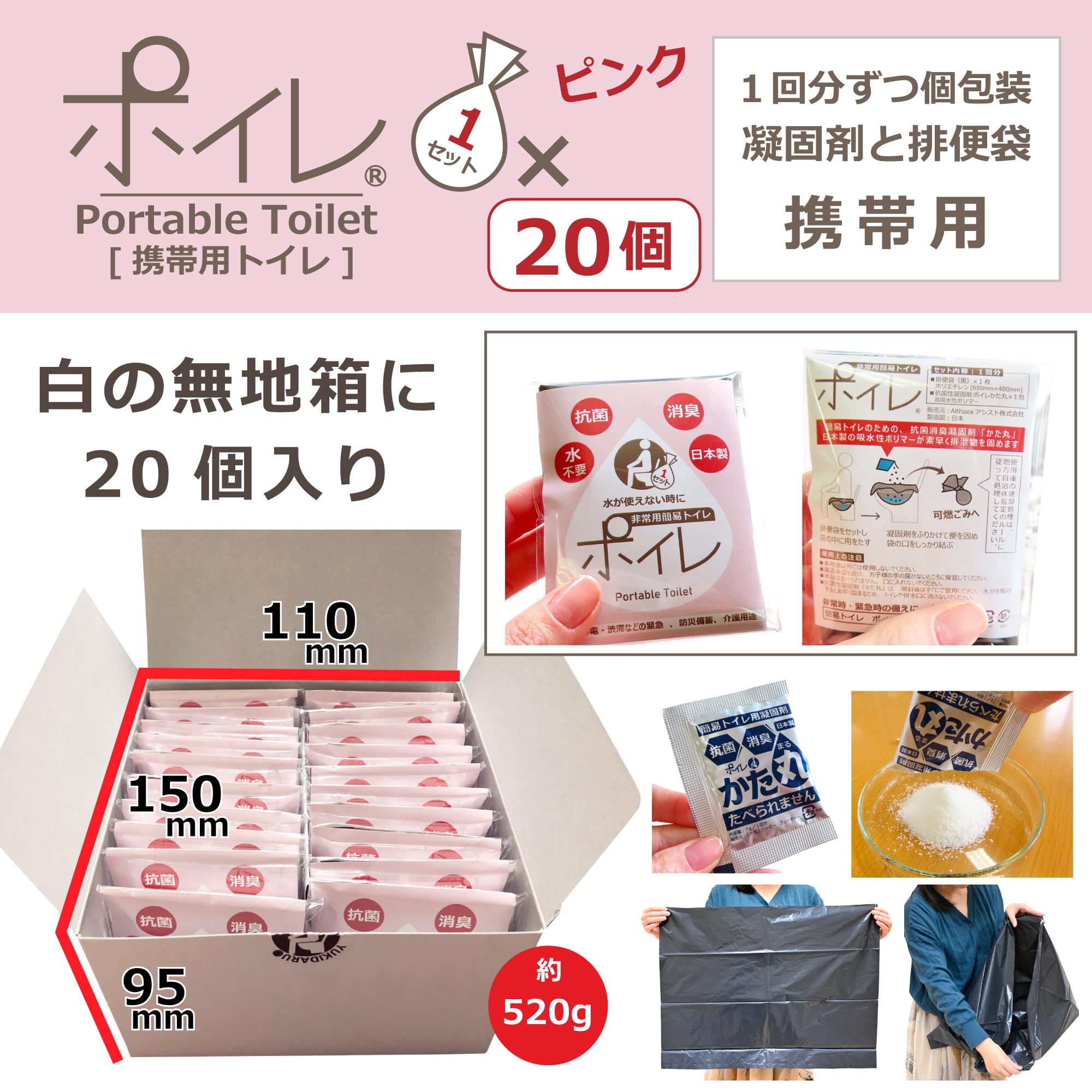 【 内容・サイズ 】[ 個包装携帯トイレ1回分セット ] ・抗菌性凝固剤「ポイレかた丸」×1包(高吸水性ポリマー) ・排便袋(黒)×1枚(ポリエチレン製/650mm×480mm) ・使用方法・使用期限はパッケージ裏面に記載 ※凝固剤は粉末です。<1個あたりの外寸:約75×90×10mm>コンパクトで保管しやすく、防災バッグやリュックにも無理なく収まります。<20個入り箱 外寸:約150 x 110 x 90mm>