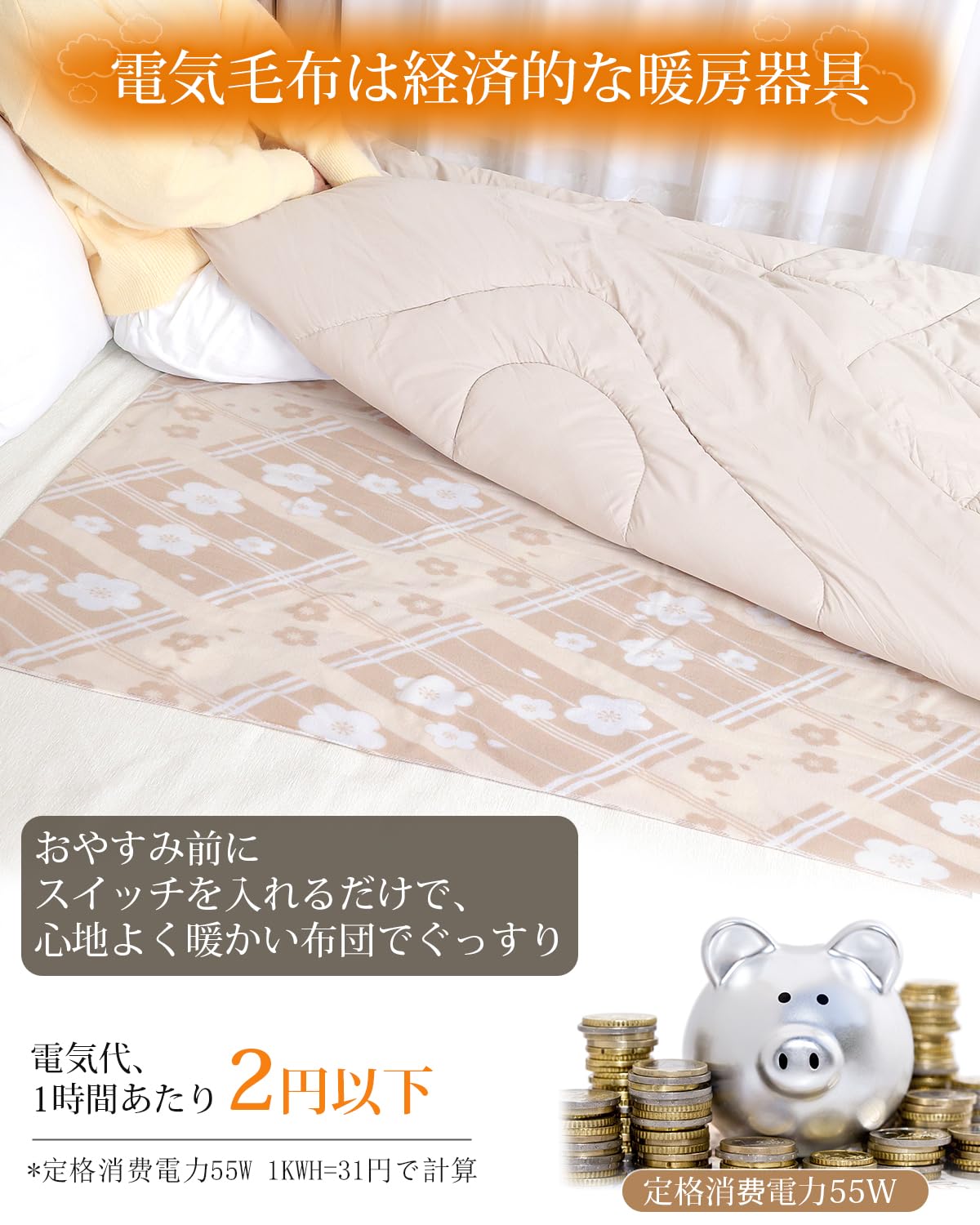 【心地良い質感・優れた保温性】電気毛布 省エネは暖かみのある両面起毛加工を採用。ふんわりと包み込んでくれるような生地で、すぐじんわりと暖かくなります。電気毛布は抜群の熱伝導性、安全性を持つ日本製高性能電熱線採用、均一で安定して素早く暖められます。温度制御、過圧保護、阻燃保護、均一加熱により安心して心地よい睡眠をサポート。優れた縫製技術のおかけで、極細繊維がちゃんと詰まっていて、肌触りだけでなく、毛玉ができにくい素材、高い保温性、速乾性と耐久性を兼ね揃えます。炭素繊維発熱線に通じで加熱するため直火なし、燃料不要、更に有害なし電気毛布です。寒い季節に冷えたベッド・ふとんや身体をぽかぽかにあたため、心地よい眠りに導いてくれる電気毛布。