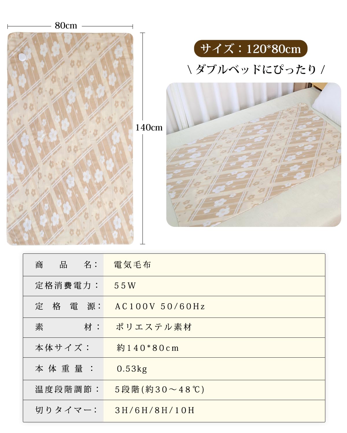 電気毛布 敷き 掛け兼用 55W 節電 切り忘れ防止タイマー付き 4段階タイマー 140×80cm 5段階温度調整 速暖 省エネ 洗濯可能 電気毛布洗える 電気ブランケット 頭寒足熱 ダニ退治 防寒対策 肩掛け 膝掛け シングル 毛玉なし 暖房器具 キャンプ オフィス 車中泊 ギフト ( 花柄)