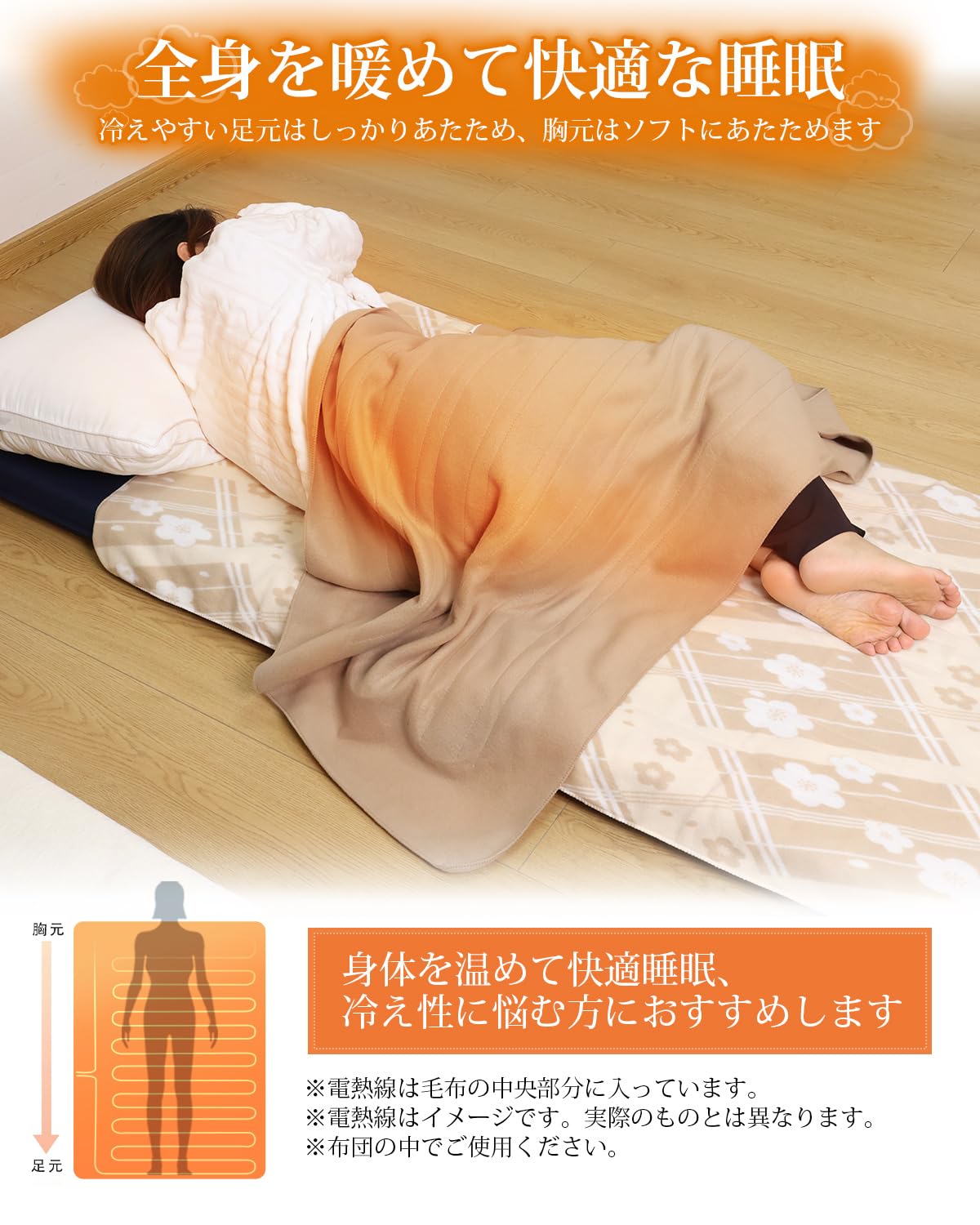 【寒い冬場の就寝時も快適に】この電気毛布敷きは寒い季節に冷えたベッド・ふとんや身体をぽかぽかにあたため、心地よい眠りに導いてくれる電気毛布。フローリングや畳からの底冷えもしっかりシャットアウトします。適切なサイズで、ひざ掛け、肩掛け、敷き毛布としても大活躍、ベッドやソファ、デスクなどのさまざまな場所でご利用いただけます。軽いため、持ち運びにも便利で、車中泊やアウトドアなど、様々なシーンで活躍します。親、家族、友達への贈り物に最適です。