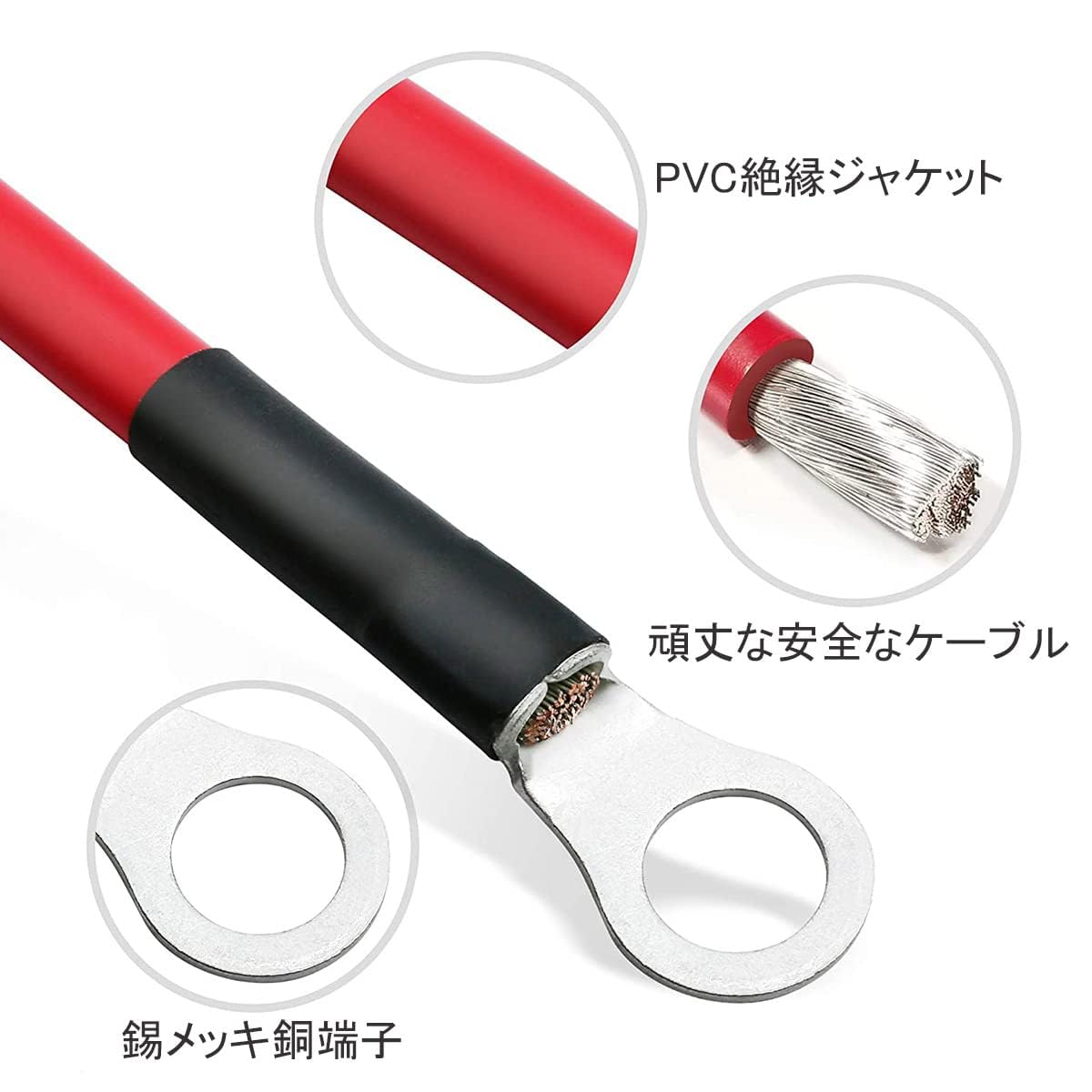 【リング端子付き】両端には金属リング状端子が付いており、バッテリー端子に簡単に接続することができます。両端に10mmの金属リング端子が付いた自動バッテリーケーブル銅。