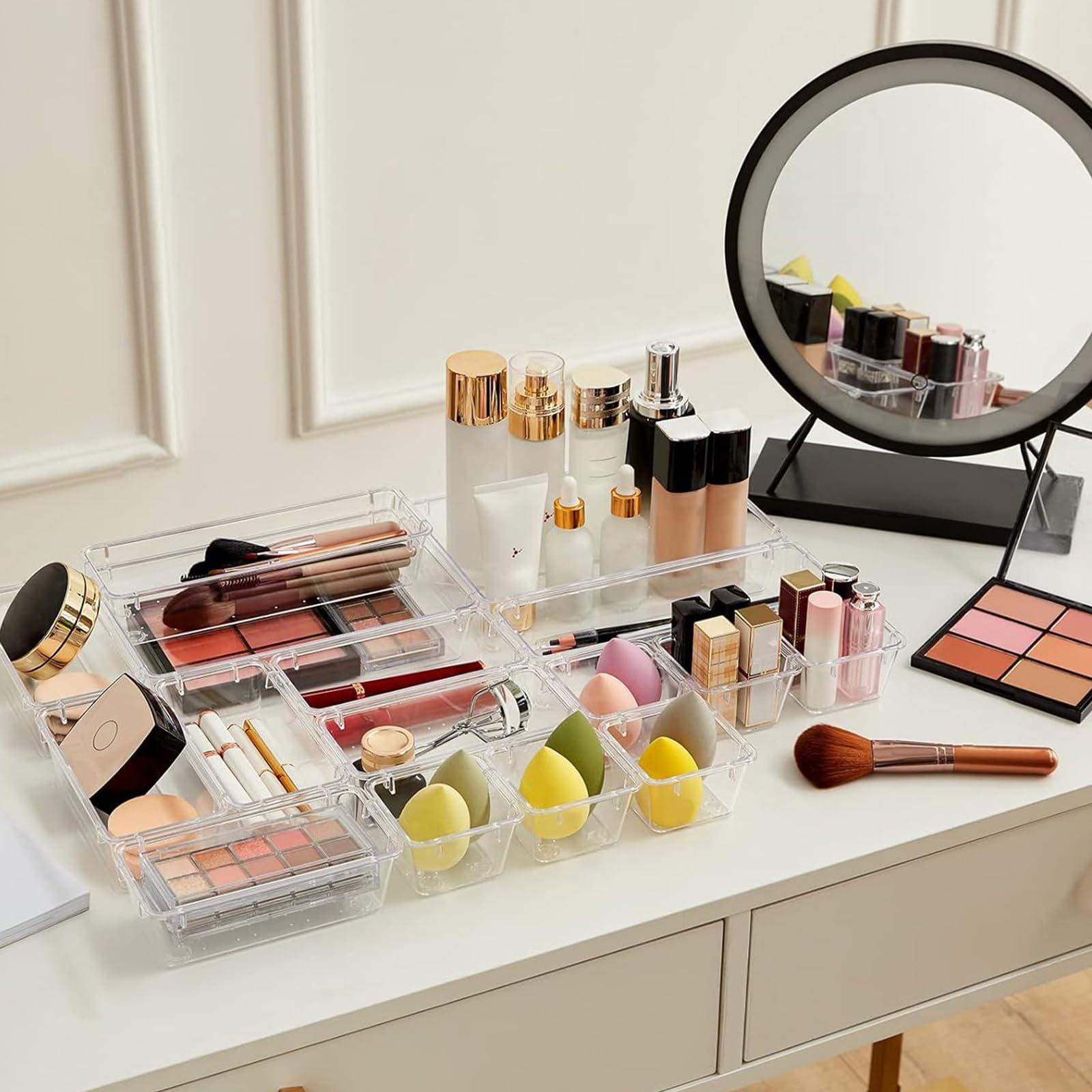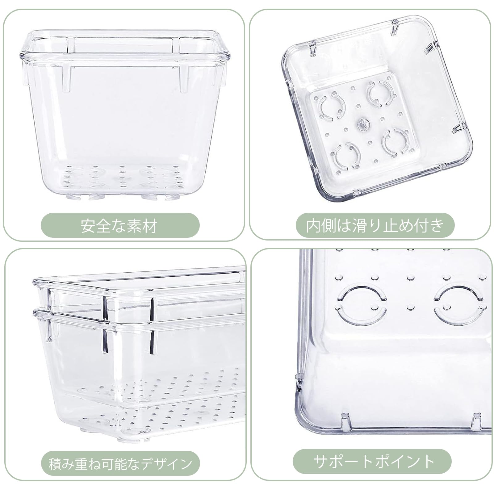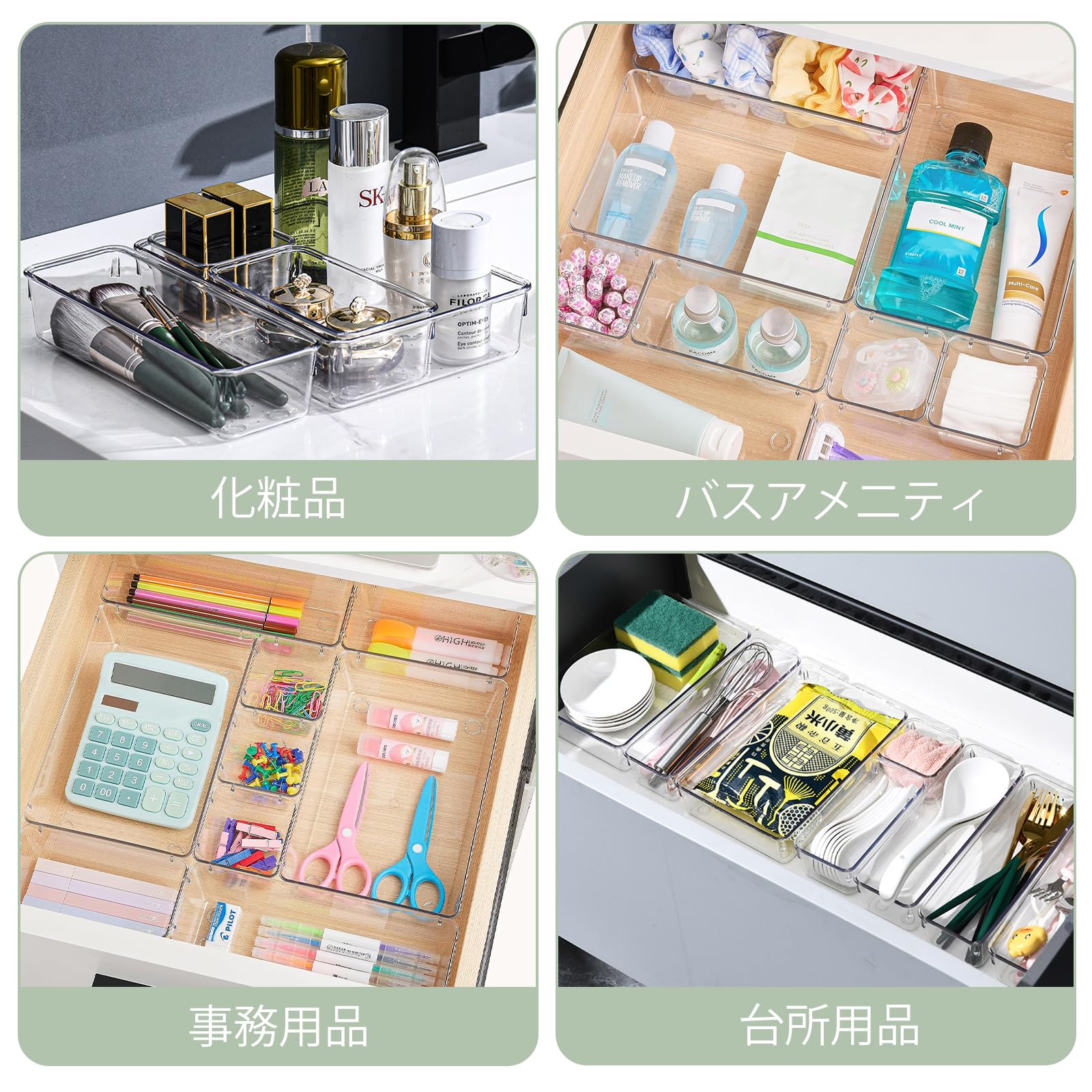 【4種サイズ】2個22.9*15.2*5.3cm、2個22.9*7.6*5.3cm、6個15.2*7.6*5.3cm、6個7.6*7.6*5.3cm。透明なデザインなので、必要なものをすぐに見つけることができます。100個の保護パッドが付きます。トレーの底に貼ると、引き出しとの直接摩擦による擦り傷を減らし、傷防止や騒音防止の役割を果たします。余計な保護パッドが他の家具にも貼れます。