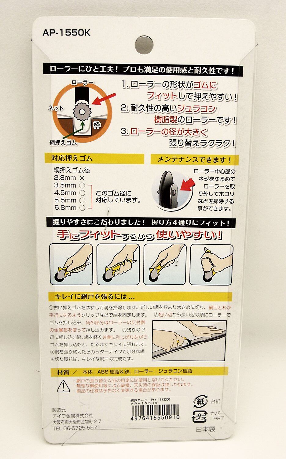 アイワ金属 網戸ローラー Pro AP-1550K 原産国:日本 対応押えゴム:3.5mm、4.5mm、5.5mm、6.8mm 張りやすさ&耐久性抜群 たくさん張り替えても疲れにくい ご注意(免責)>必ずお読みください ・網戸の張り替え以外の用途には使用しないでください。 ・無理な御使用等による破損、天災時のは致しかねます。 ・商品の仕様は予告なく変更する場合があります。