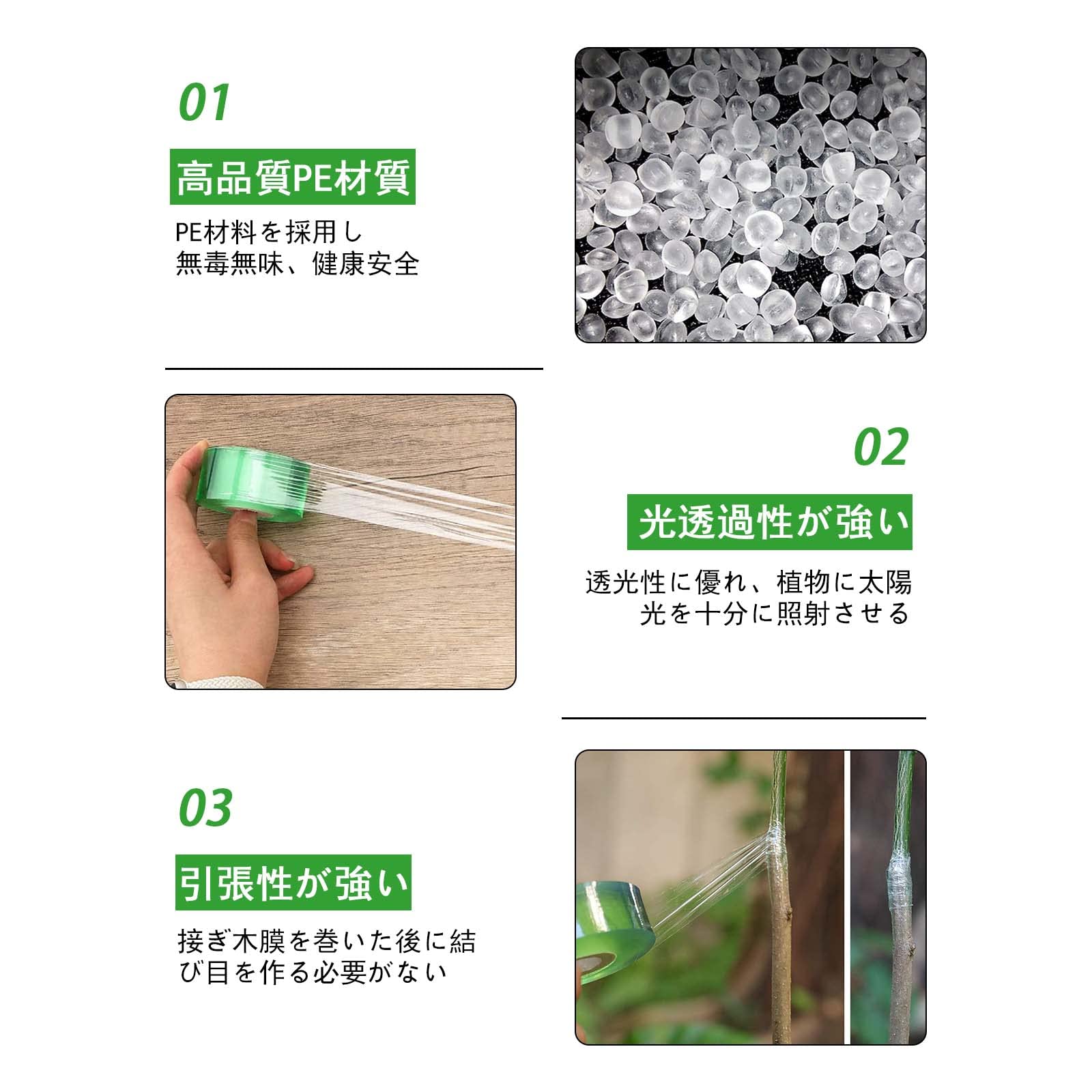 【素材】グラフトフィルムは、高品質なPEフィルム素材を使用しています。 テープは非常に薄く、強度があり、透明で、優れた引張特性を有しています。
