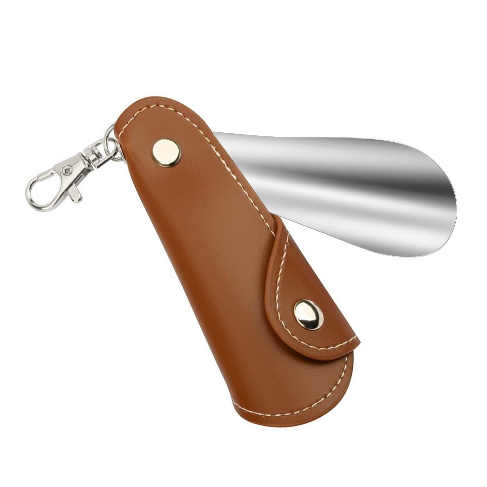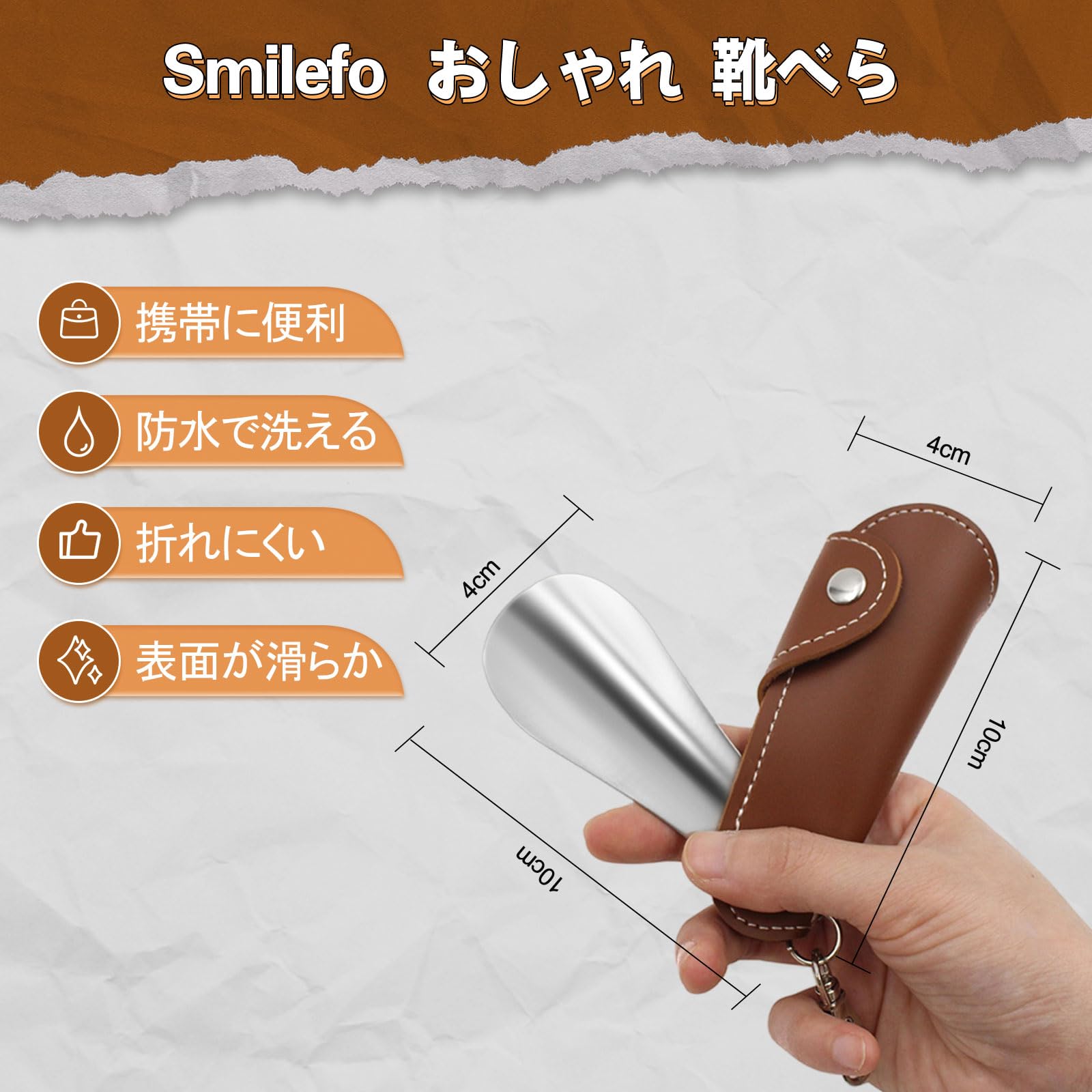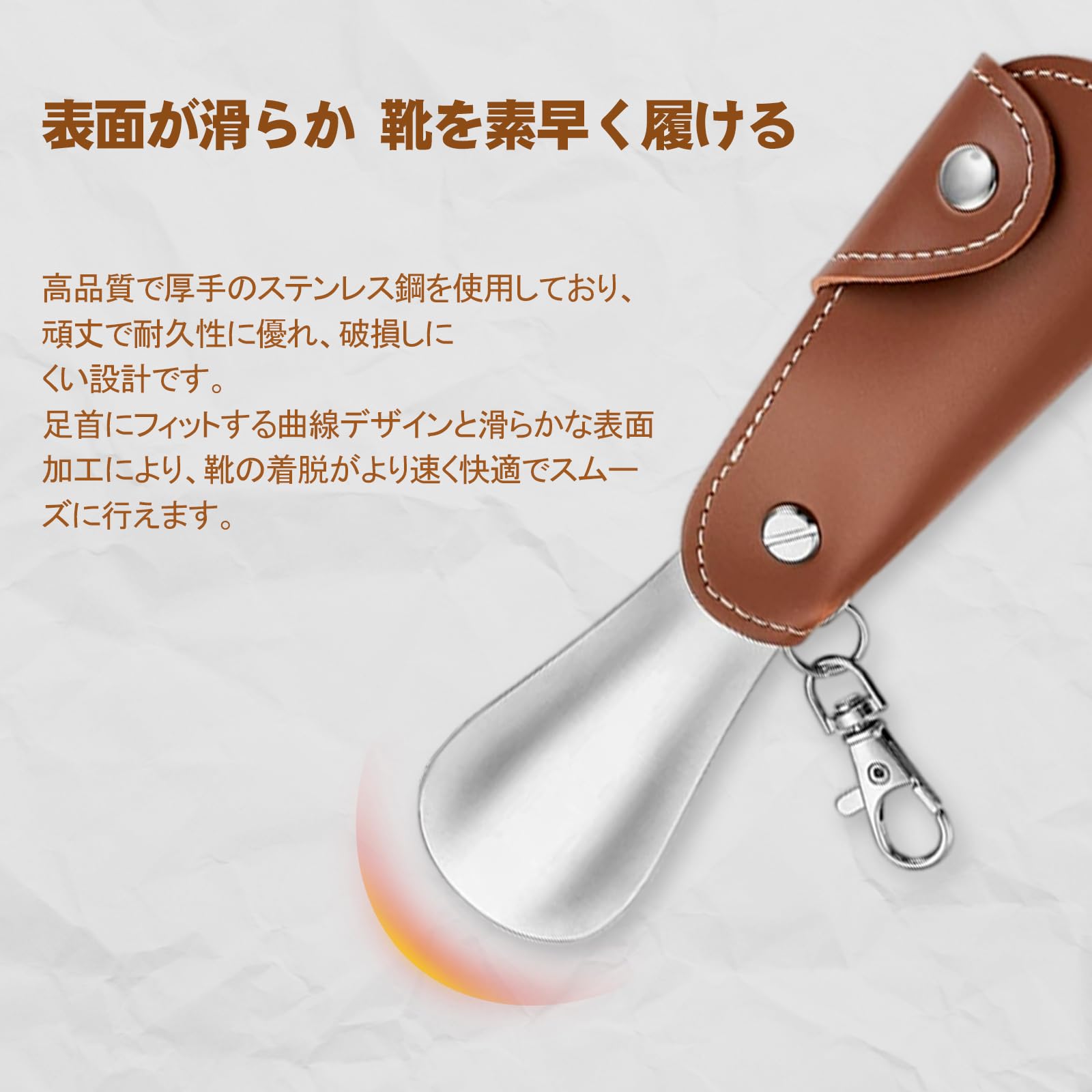 Smilefoot 靴ベラ キーホルダー 、ミニサイズで携帯可能、高品質レザーカバー付き、おしゃれで高級感がありアクセサリーとしても携帯可。靴べら ミニ ステンレス製で滑らかな質感、足首のカーブにフィットする設計で使いやすく、ヒール、革靴、スニーカーなど様々な靴に最適。靴べら おしゃれ 家庭用、玄関、ビジネス、ゴルフなど多様なシーンで活用可能。男女兼用、子供や高齢者にも使いやすいデザイン。
