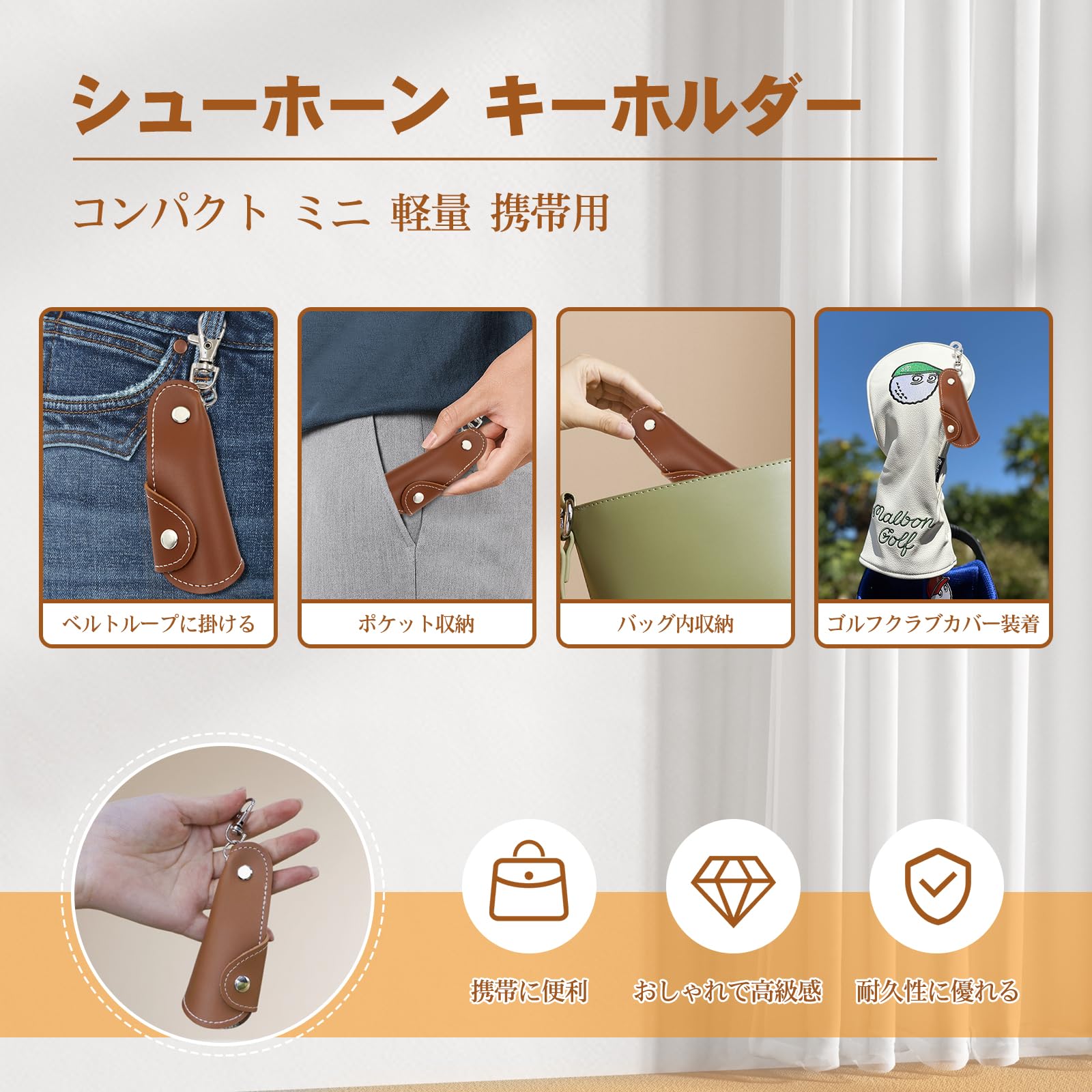 【便利なキーホルダー付き】靴ベラ キーホルダー 付属のキーリングでバッグやゴルフプッターカバーに簡単装着でき、必要な時にすぐ使用可能。