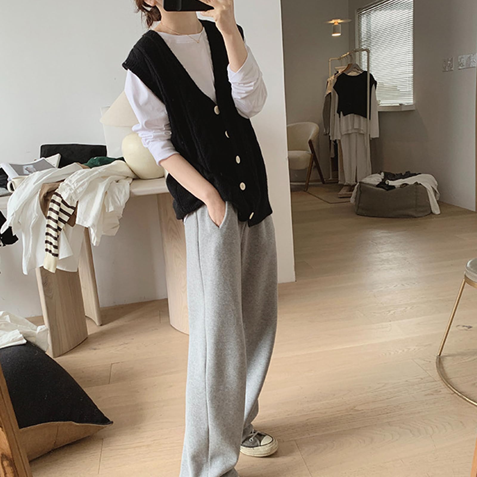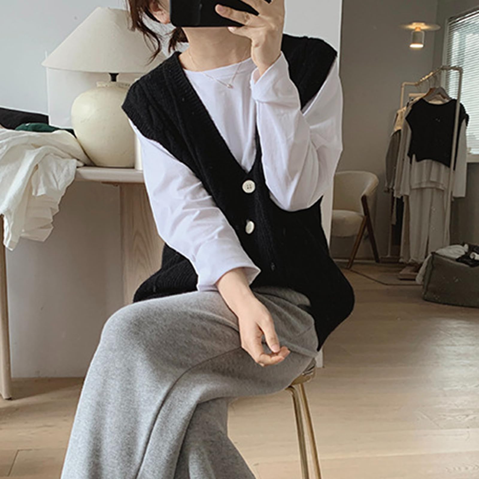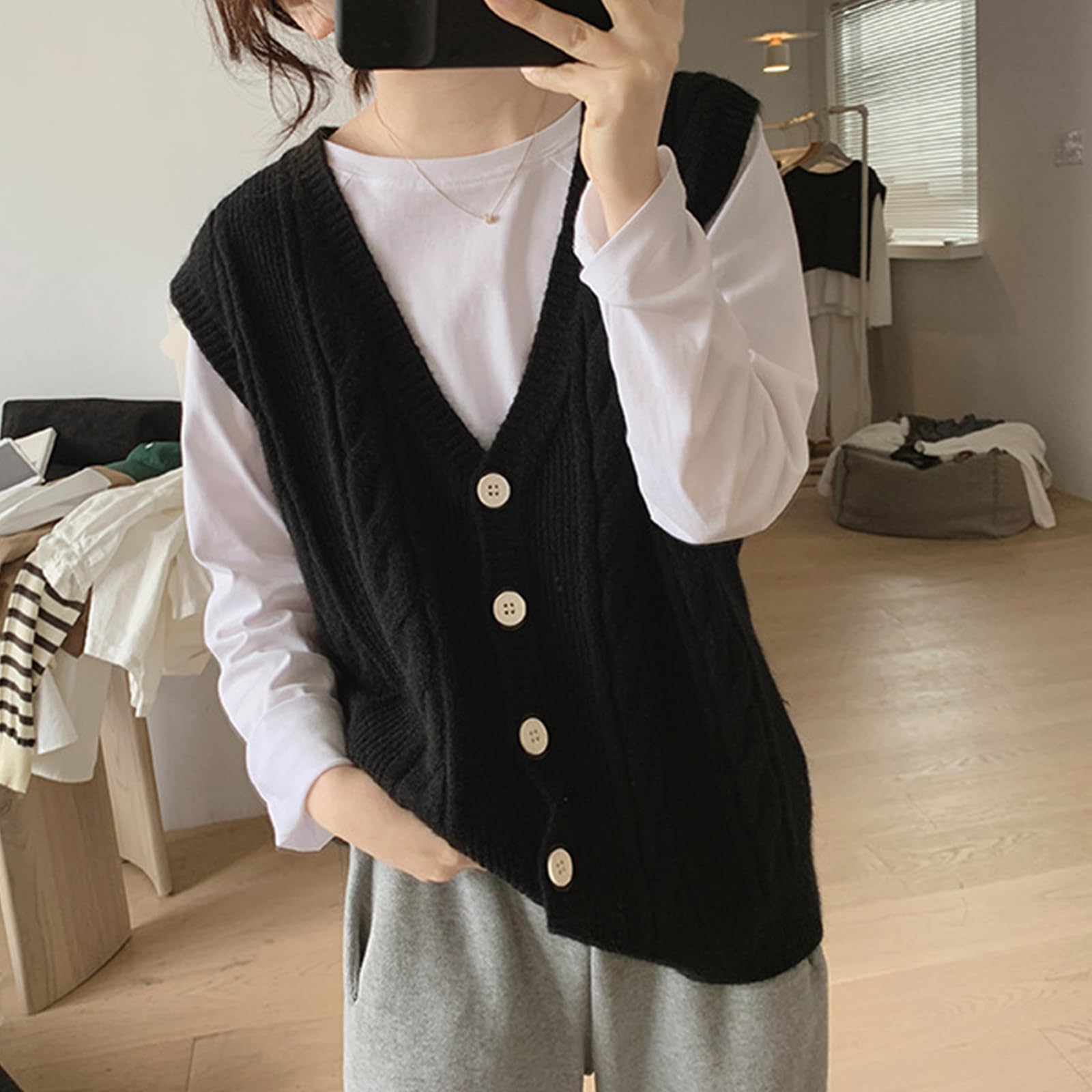 [SeiunAn] ニットベスト レディース セーター ロングベスト 秋冬春 前開き ノースリーブ ケーブルニット Vネック 薄手 大きいサイズ ゆったり 韓国 おしゃれ トップス 重ね着 ボタン 女子 通勤 きれいめ ジレ