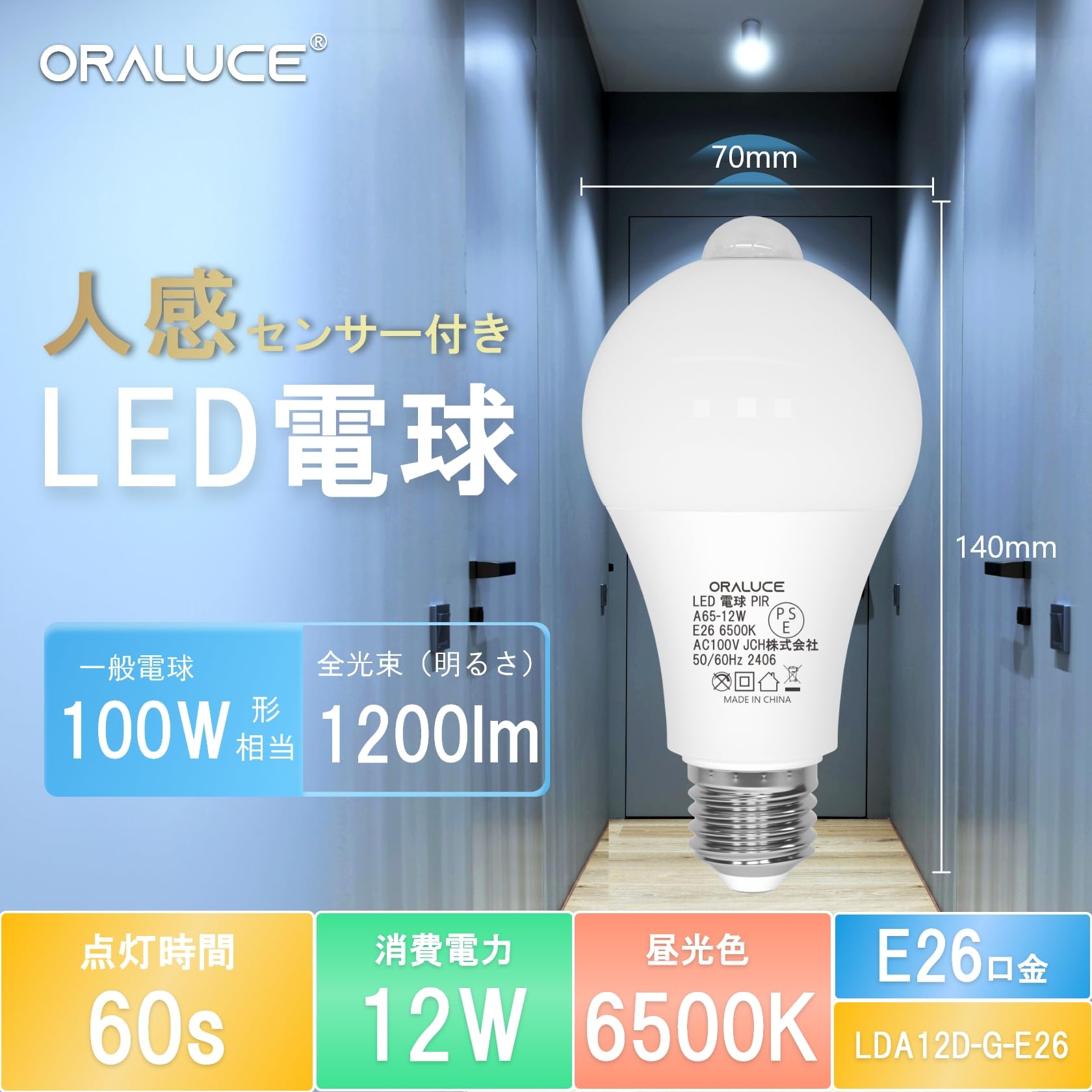 【努力特価】ORALUCE LED電球 E26口金 人感センサー 電球 100W形相当 昼光色 6500K 12W 1200lm 自動点灯・消灯 明暗センサー付 消し忘れ防止 階段 玄関 廊下 トイレ 調光不可 2個入 LDA12D-G-E26