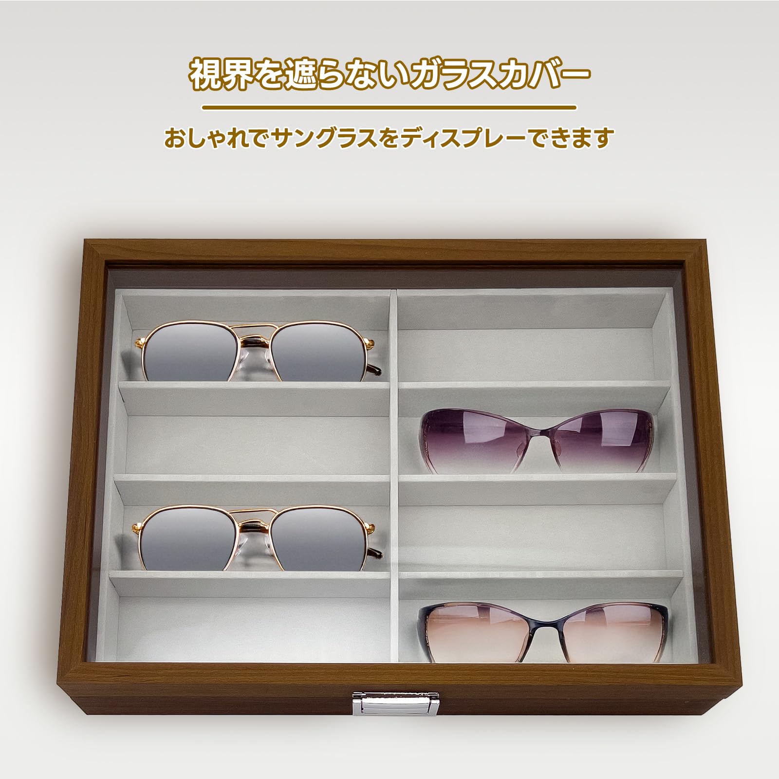収容数:サングラスを8本まとめて収納できる高級感あふれる蓋つきケース。