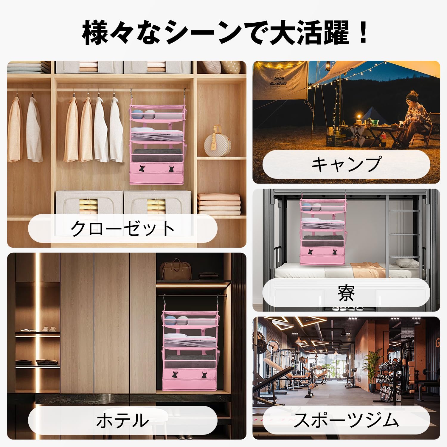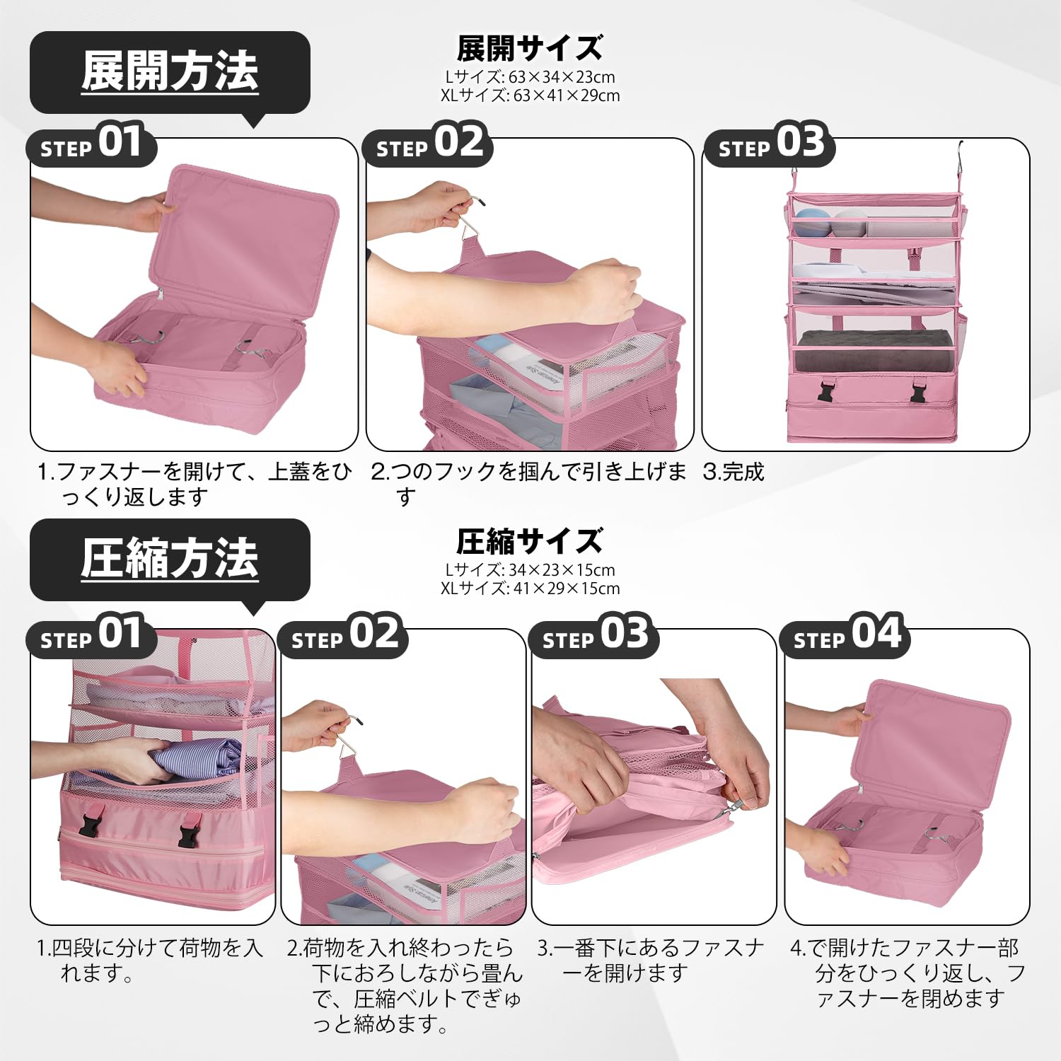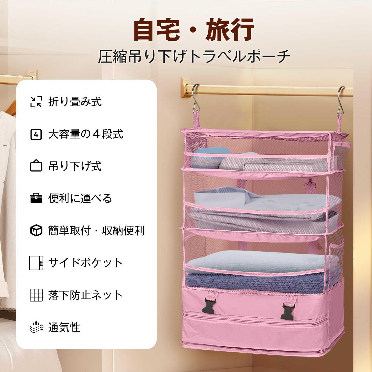 【数量限り】VARNIC 吊り下げ収納 トラベルポーチ 落下防止ネット付き クローゼット 旅行 出張 ポータブル 吊り下げ収納ケース 衣類ラック 収納 大容量 4段 省スペース 折り畳み式 取付簡単 トラベル 吊り下げ 通気性 防臭 (ピンク X-Large)