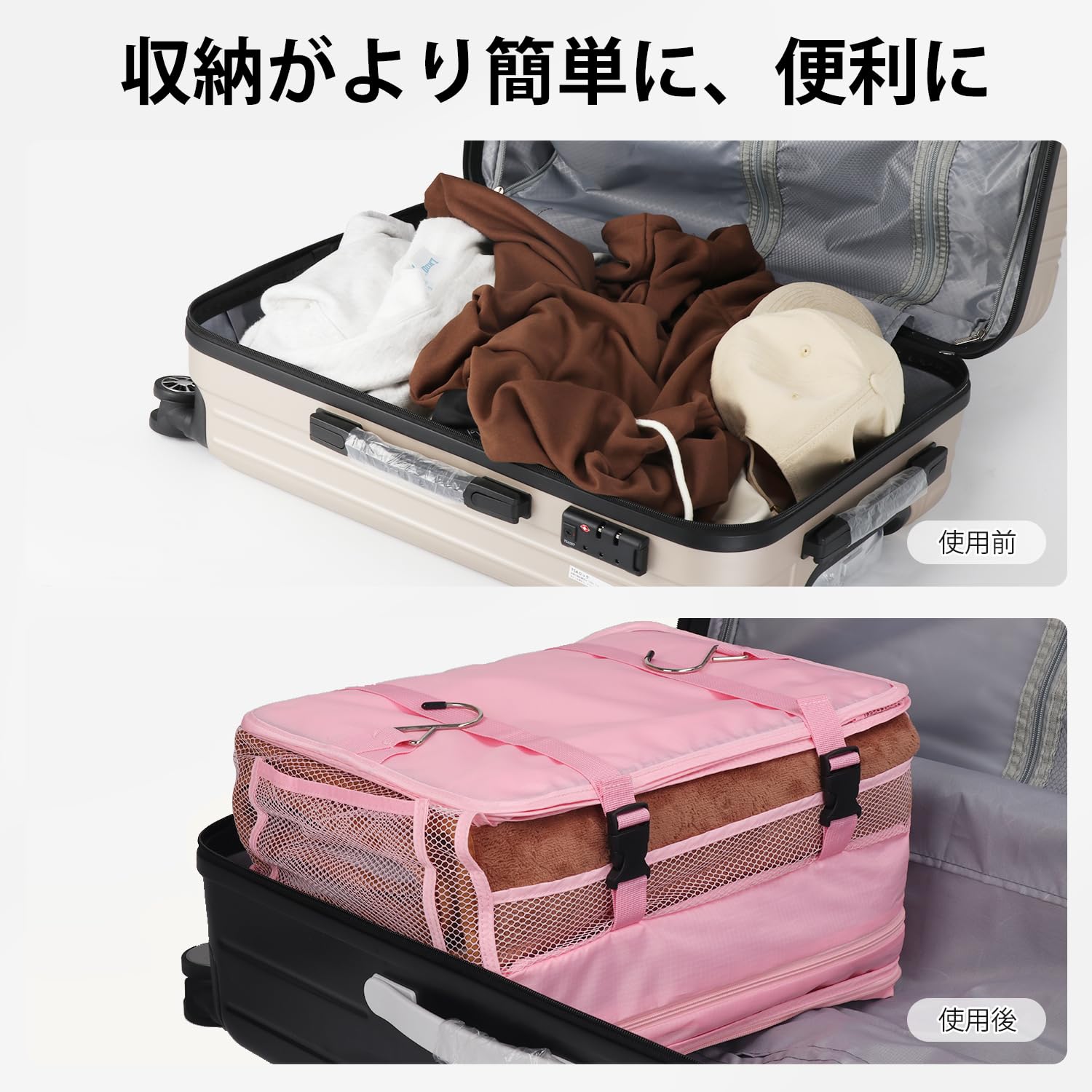 【折り畳み式】旅行や出張の時、荷物をトラベルポーチに入れて折り畳んで、スーツケースの中を綺麗にスッキリ整理できます。取り付けや出し入れも簡単です。衣類を取り出したい時はトラベルポーチを取り出すだけで良いので、煩わしさから解放されます。使わない時はコンパクトに折りたたんで収納できます。