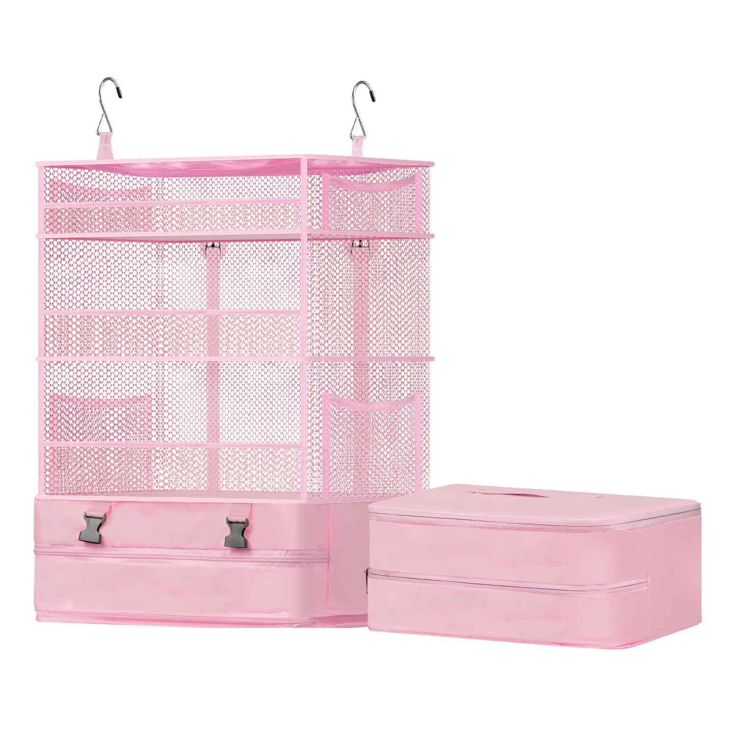 VARNIC 吊り下げ収納 トラベルポーチ 落下防止ネット付き クローゼット 旅行 出張 ポータブル 吊り下げ収納ケース 衣類ラック 収納 大容量 4段 省スペース 折り畳み式 取付簡単 トラベル 吊り下げ 通気性 防臭 (ピンク, X-Large)