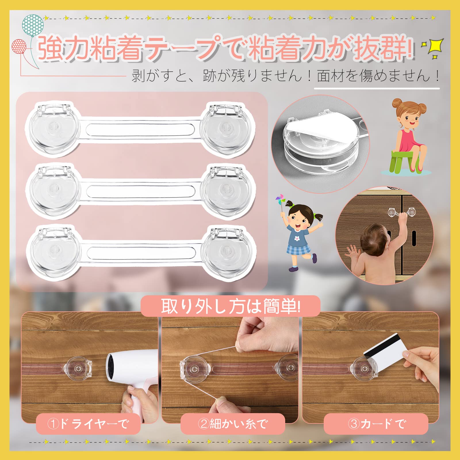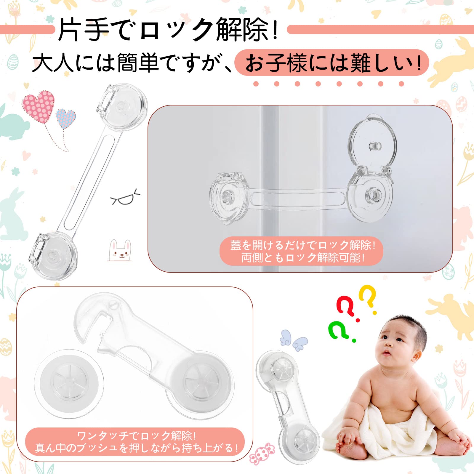 【簡単設置&片手でロック解除】工具を使わずに、お好みの箇所に強力な両面テープで貼り付けるだけの簡単設置。長いタイプ:ベビーロックの両側の蓋のどちらかでも開けるだけでロック解除されます。短いタイプ:ワンタッチでロック解除!