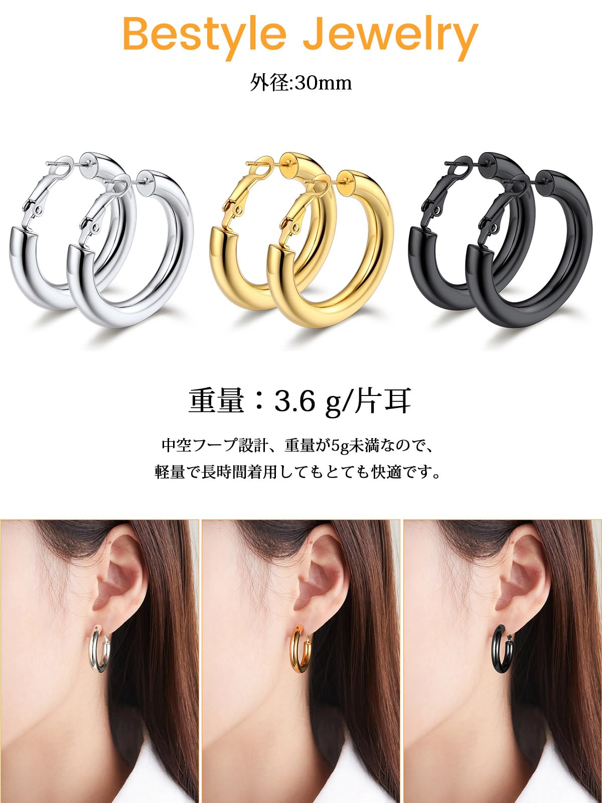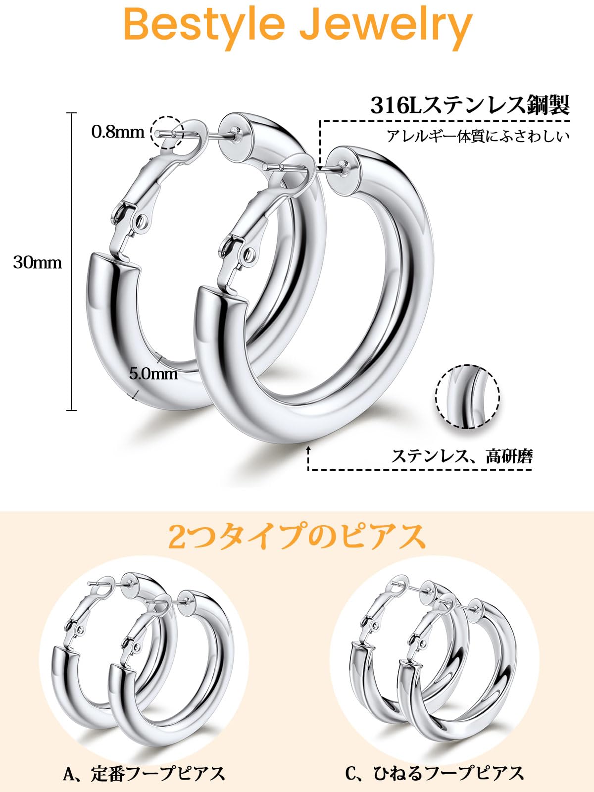 【特価処分】Bestyle フープピアス 大きめ レディース リンクピアス サージカルステンレス 金属アレルギー対応 つけっぱなし 両耳 太め シンプル 人気 アクセサリー プレゼント 新年 クリスマス 母の日
