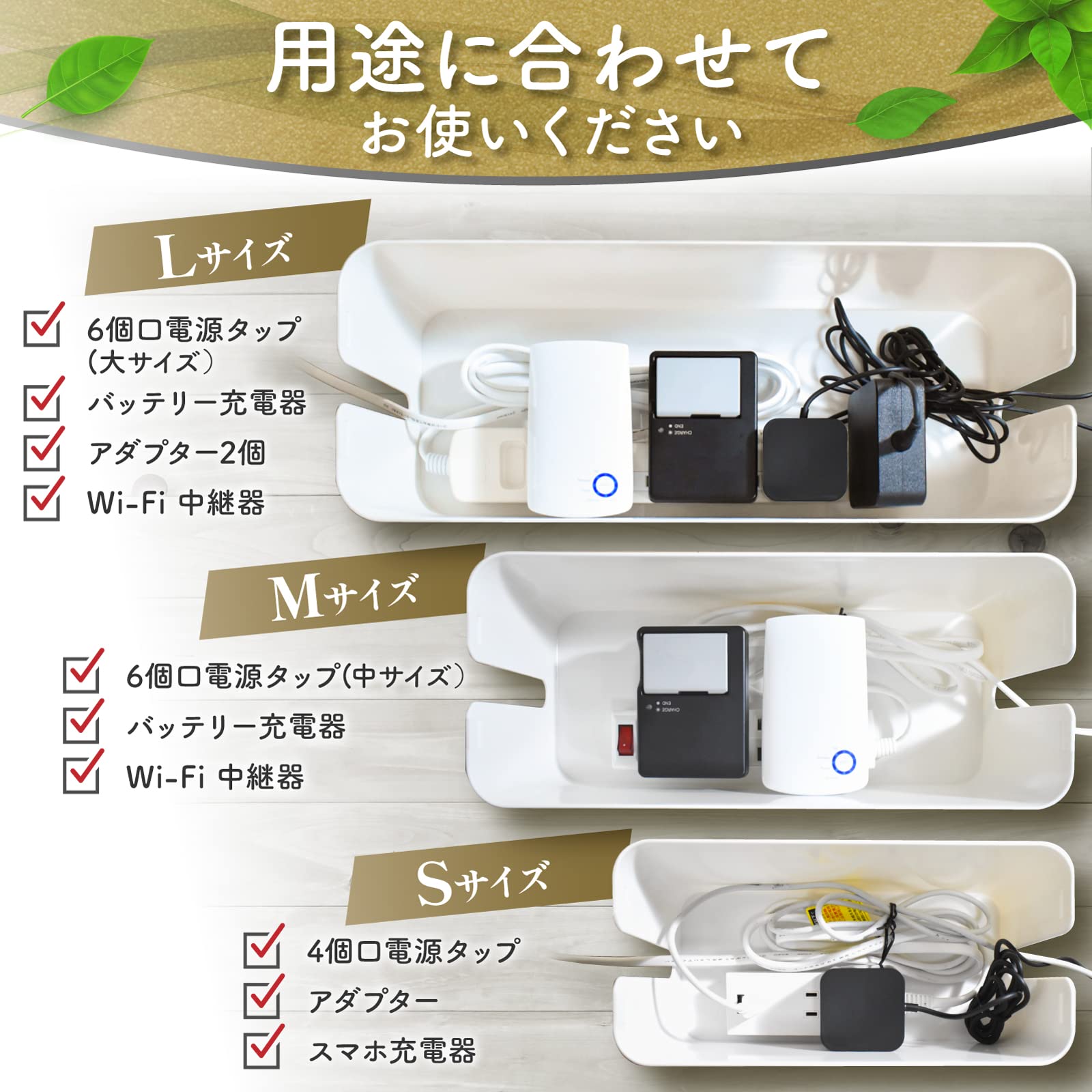?【商品詳細】材質:プラスチック カラー:ホワイト、ブラック、グレー、ブラック木目、ホワイト木目 商品外寸:L幅406×奥行156×高さ135M幅320×奥行135×高さ125 S幅235×奥行115×高さ120 ※サイズの誤差は多少発生します。ご了承下さい。 ケーブル結束バンド3本付属