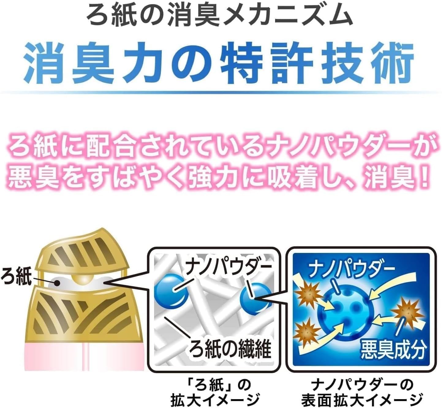 【ナノパウダー※配合】すばやく強力に空間を消臭。※ナノレベルの孔(あな)を持つ、悪臭を吸着する消臭剤。