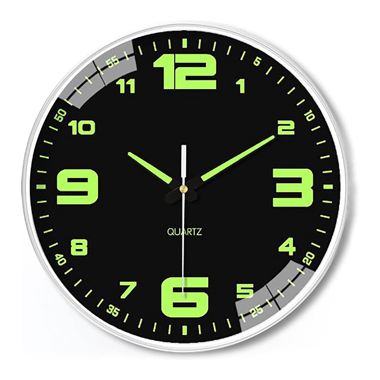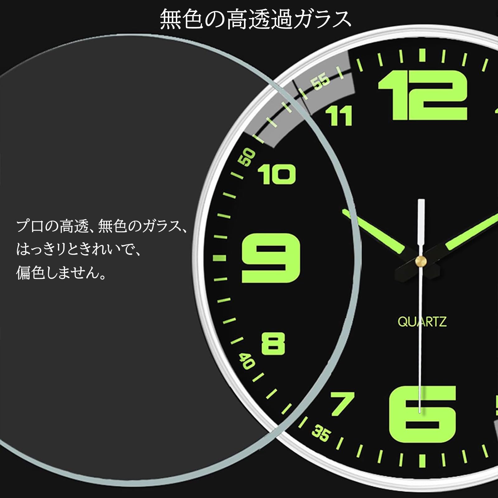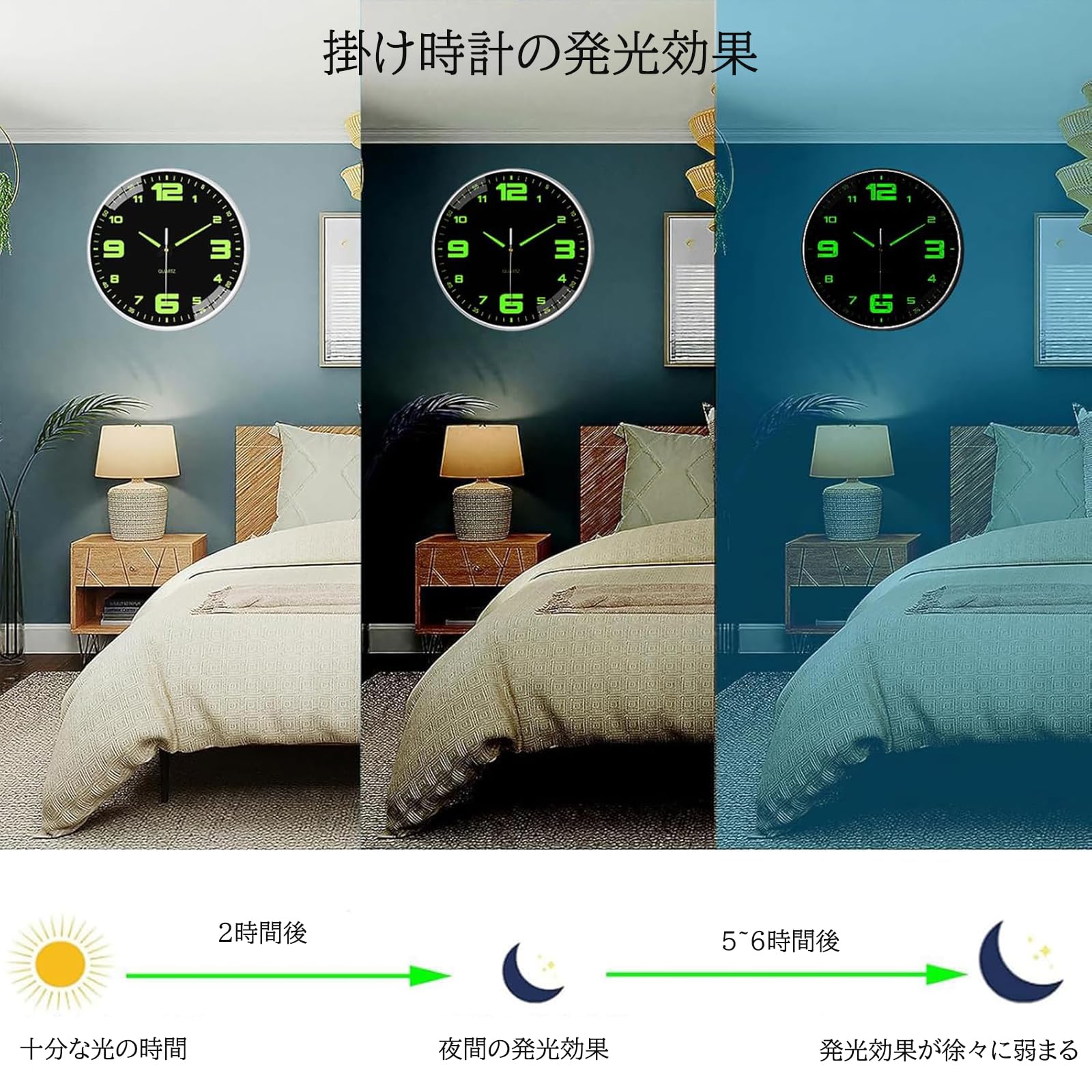 【夜光掛け時計】大きくてクリアな3Dアラビア数字で、お部屋の隅から見やすいです。時計盤面のインデックスと指針には蛍光塗料を印刷していたので、蓄光後、暗い所で発光できて、夜時間も確認できます。