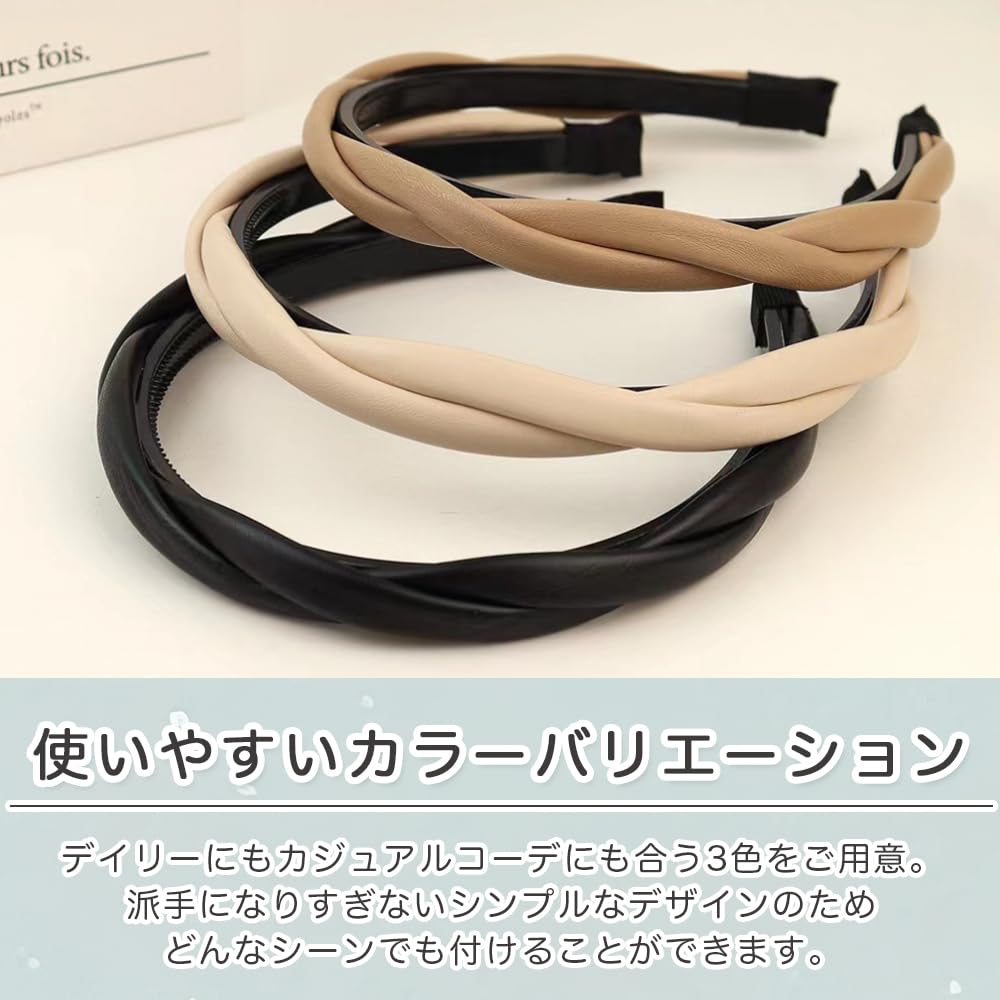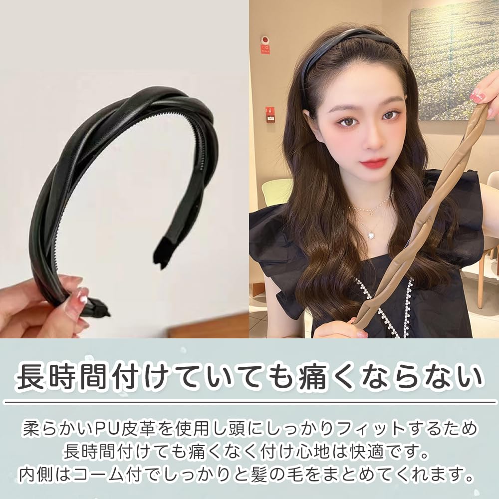 ロドリーミシェ カチューシャ フェイクレザー 痛くない ヘアバンド オシャレ シンプル コーム付き カワイイ ヘアアレンジ ツイスト 編み込み風 ヘッドバンド レディース No90 ブラック ブラウン