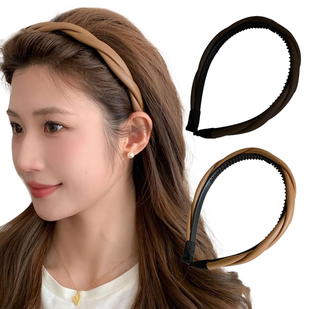 【特価処分】ロドリーミシェ カチューシャ フェイクレザー 痛くない ヘアバンド オシャレ シンプル コーム付き カワイイ ヘアアレンジ ツイスト 編み込み風 ヘッドバンド レディース No90 ブラック ブラウン