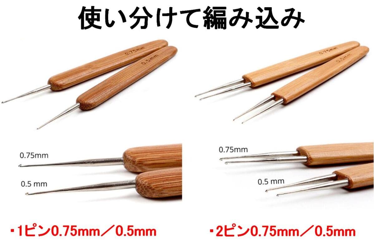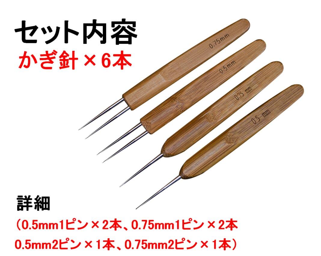 セット内容:かぎ針×6本(0.5mm1ピン×2本、0.75mm1ピン×2本、0.5mm2ピン×1本、0.75mm2ピン×1本)