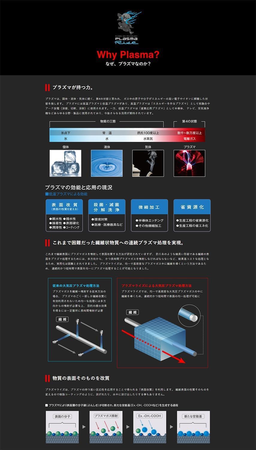 機能: 「プラズマライズ (撥水性を高め、吸水による劣化を大幅に軽減)」「エクスパンションエフェクトカラー (EXPANSION EFFECT COLOR)」