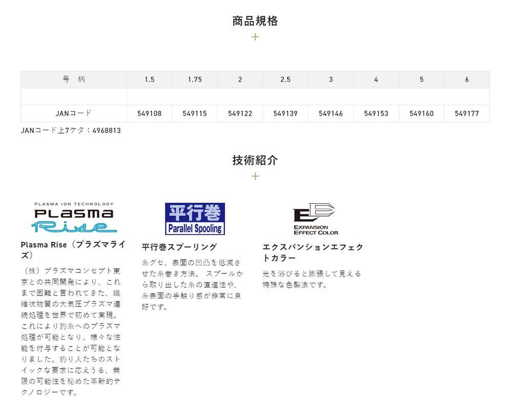 コンセプト: 白糸のキング!! 光を浴びると膨張して見える特殊な色製法でアタリをあぶり出す。「プラズマライズ」でナイロンラインの弱点でもある吸水による劣化を大幅に軽減。