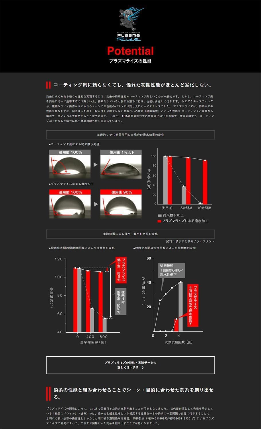 さらに当社独自技術【プラズマライズ】を施すことで【撥水性を高め、ナイロンラインの弱点でもある吸水による劣化を大幅に軽減】。