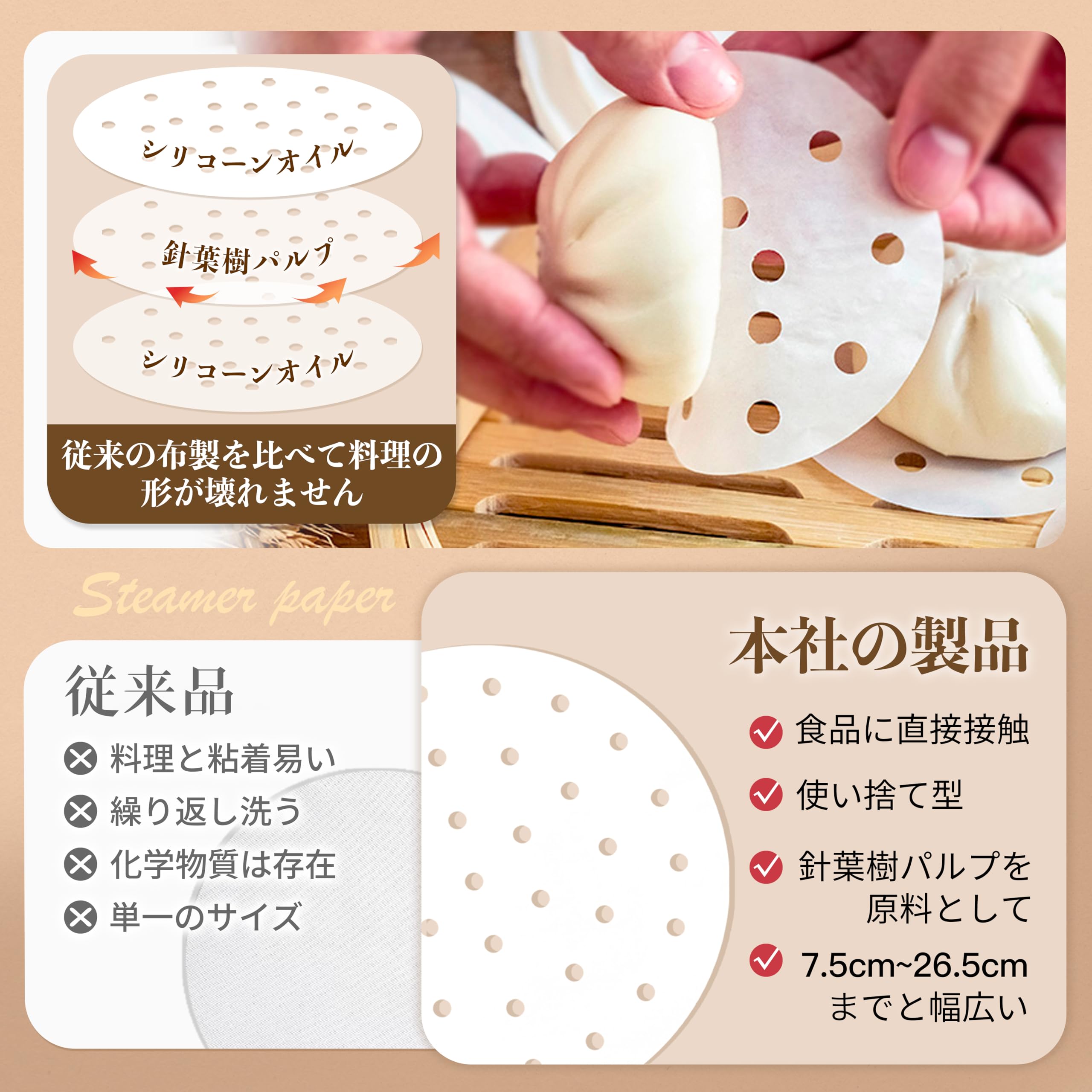 【粘着しにくい】素材は針葉樹パルプを原料とし、両面に食品用シリコーンオイルで作られています。これにより、食べ物がシートに粘着しにくく、蒸し器での使用時に簡単に取り外すことができます